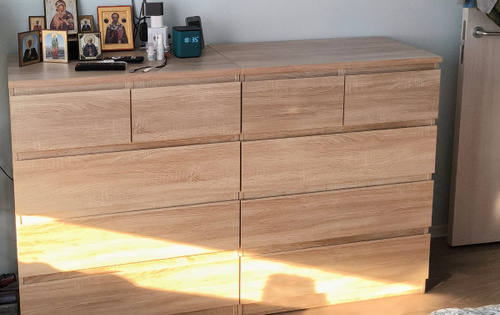 Сам комод сделан под Икею, но это не она - видно по обработке деталей, по их весу, по фрезеровке; тем не менее собрал в одного за часок-полтора, роликовые направляющие хороши, но немного гуляют ящики из стороны в сторону - не критично, но всегда будет до чего докопаться😆