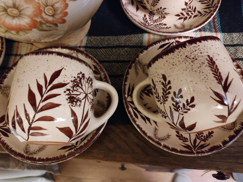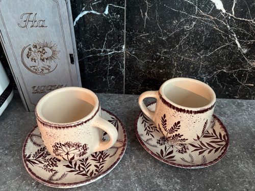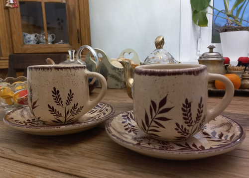 - 2 чайных блюдца, дополняющих дизайн кружек.