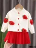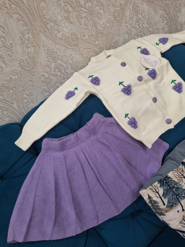 Очень нарядный костюм. Размер 130 подошёл хорошо на рост 120. Юбочка по колено. Приятная ткань. Пошив аккуратный. Посмотрим, как поведёт себя после стирки. Если не будут образовываться катышки, то можно и 10 звезд поставить.