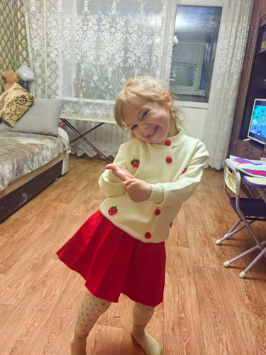 Кофта покрасилась от юбки во время транспортировки. отстирать не смогла. от 1 раза стирки начинаются катышки. Оставила лишь потому что ребёнку очень понравилось.