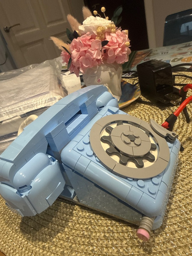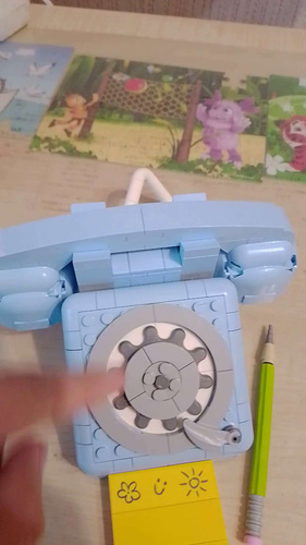 Неизменное качество Lego! Оригинальный набор, который наглядно показывает развитие современного телефонного аппарата. Первая модель - дисковый телефон ( наши дети такого вживую никогда не видели, разве что в музее!) диск крутиться, когда кладёшь трубку- рычажки чуть-чуть подпружинивают.