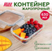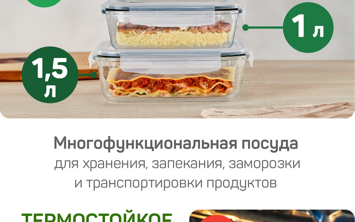 • Контейнер для хранения еды устойчив к температурным перепадам. У посуды из жаропрочного стекла повышенная ударопрочность и стойкость к деформации. Контейнер для хранения продуктов держит тепло и свежесть пищи, не пропускает воздух и запахи, позволяет не заветривать продукты. Контейнер для заморозки можно использовать в духовке и СВЧ печи (без крышки), посудомоечной машине, морозильной камере. Контейнер для еды герметичный не впитывает запахи. Современную форму из неполимерного контейнера можно использовать для сервировки стола. Товар полностью безопасен и не содержит бисфенол А.