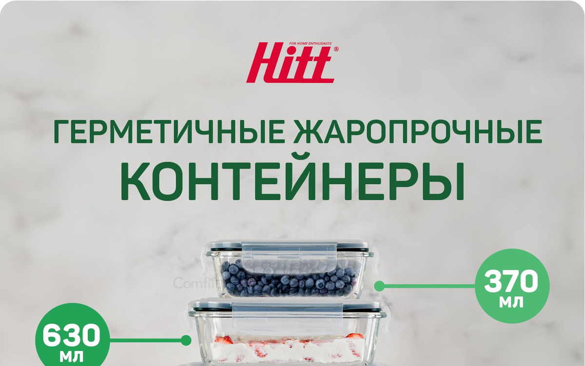 Hitt представляет разные контейнеры для еды и хранения продуктов: стеклянные и пластиковые, герметичные и негерметичные, разные по объему. Можно собрать собственную коллекцию контейнеров по вашим потребностям.
