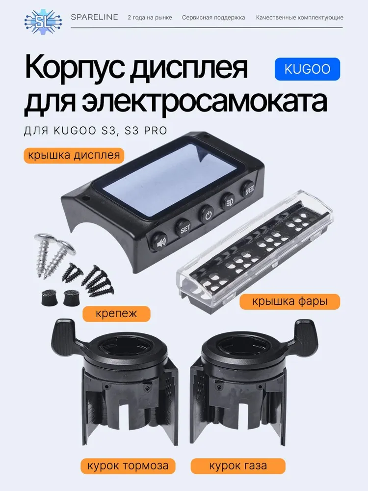 Набор включает в себя новое стекло светодиодного фонаря (фары) с сотами для платы, далее стекло она же крышка дисплея/экрана и новые сменные курки левый тормоз и правый курок газа.