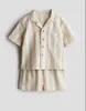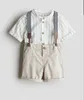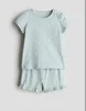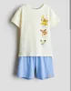 Комплект включает футболку с принтом и шорты из трикотажа из мягкого хлопка. Футболка с круглым вырезом в рубчик и застежками по бокам (не 98-104 размера) и облегающими плечами. К ним прилагаются шорты с эластичным поясом на шнурке.