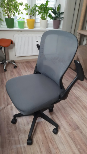 Стул мне понравился. Удобнее предыдущего - достаточно низкий, ноги удобно достают до пола. Посадка тоже для меня удобная - с небольшим завалом назад. А вот с прямой спиной на краешке сидеть будет наверное неудобно - сидушка сделана так, что сама тебя немного заваливает назад =)