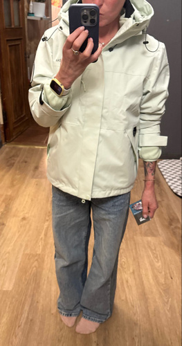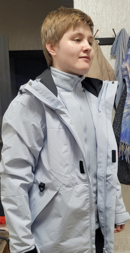 Очень понравилась. Можно носить как вместе, так и отдельно как ветровку. Приятный голубой цвет. На мой 46 размер подошёл размер 48. Лучше брать на размер больше. Спасибо!