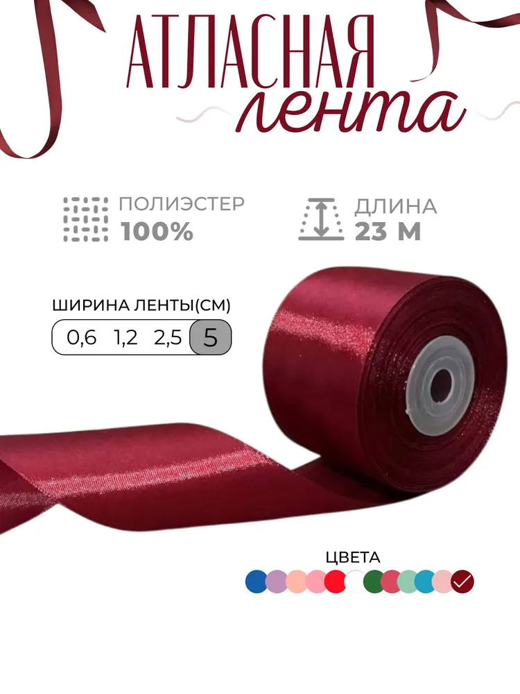 Лента атласная красная, бордовая 5см (50мм), длина 23 метра. Широкая ленточка может использоваться для букетов и цветов. Лента подарочная, упаковочная - хорошее решение для упаковки подарков.