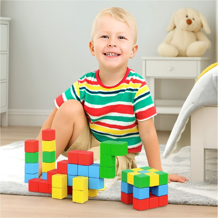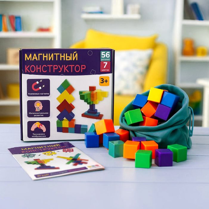 🌈 Яркие магнитные кубики помогают ребёнку строить, исследовать и открывать новый мир каждый день. В комплекте — 56 ярких кубиков в 7 цветовых решениях. Размер каждого магнитного блока — 2×2 см, что оптимально для комфортного захвата маленькими ручками.