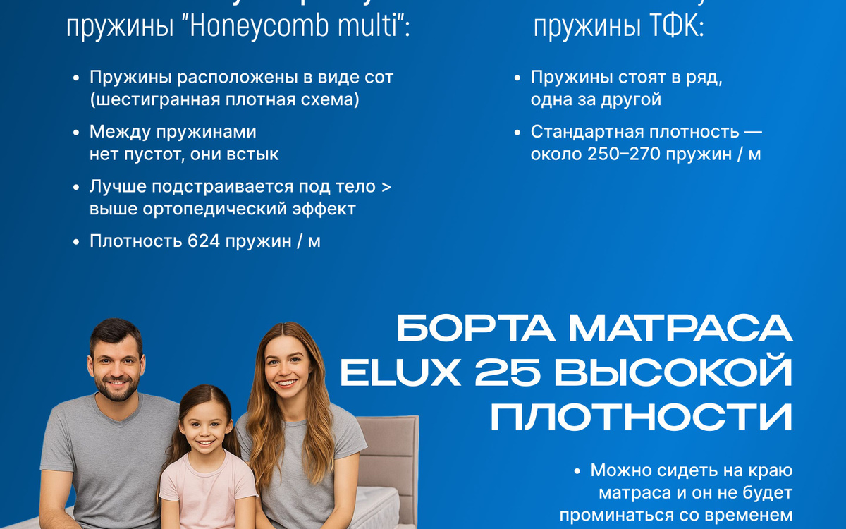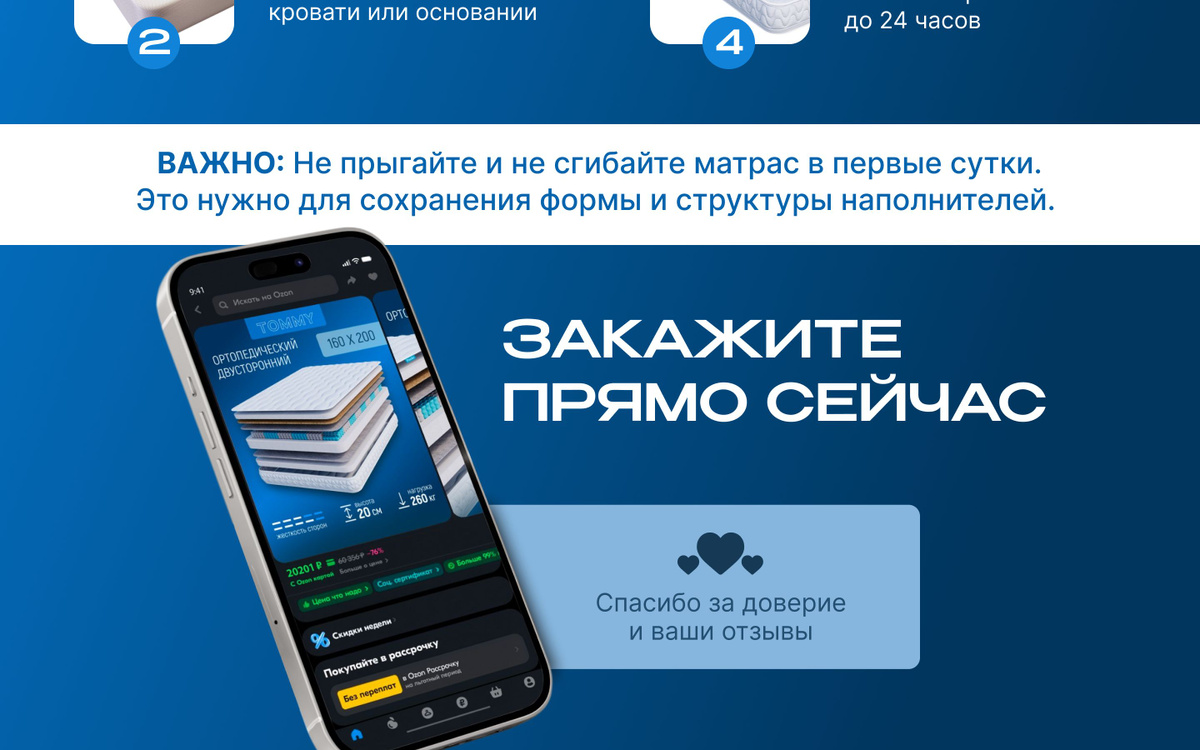 Здравствуйте! Спасибо большое за ваше сообщение и интерес к нашим матрасам 🙌 Вы правы — на Ozon мы недавно, поэтому отзывов пока немного. Но на рынке мы уже более 10 лет. Всё это время работали в формате B2B с премиальными отелями, где особенно важны качество, долговечность и надёжность. Сейчас решили выйти на маркетплейсы, чтобы сделать наши матрасы доступнее для широкой аудитории. Модель TRINO — действительно качественный и продуманный матрас: 1. Используем пену EL25 по периметру, чтобы матрас не проседал по краям и долго сохранял форму. 2. В основе — пружинный блок “Соты Мульт” с 624 пружинами на спальное место — это премиальное решение, которое встречается менее чем у 3% матрасов на маркетплейсе. 3. Матрас имеет стильный и аккуратный дизайн бортов, хорошо выглядит даже без наматрасника. Если вы не можете определиться с размером — в описании и на слайдах товара есть понятная инструкция, как правильно сделать замеры и выбрать подходящий вариант. Если останутся вопросы — с радостью подскажем! Спасибо, что обратили внимание 🙏
