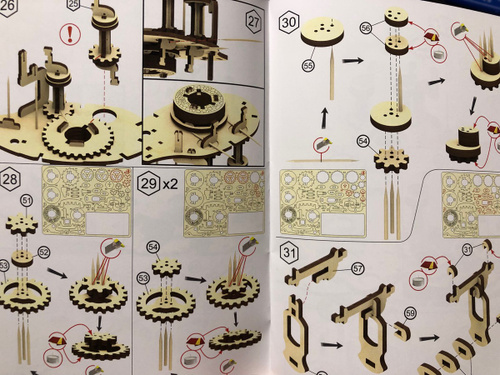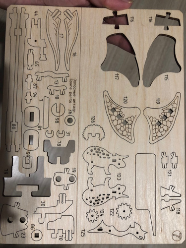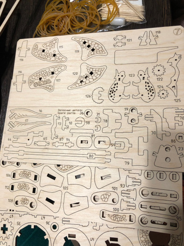 Вырезано лазером идеально. Но два жирных минуса! Вырезано из фанеры низкого качества. Предположу что из дешёвой берёзы. Если вдруг вы повторно разобрали, что бы исправить неточность и неправильность сборки. То при разборке и сборке вы заметите что, от вращающихся деталей и фиксирующих эти детали стопоров, осыпаются на стол, мелкие кусочки фанеры. Сами... Читать полностью
