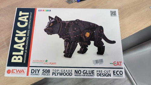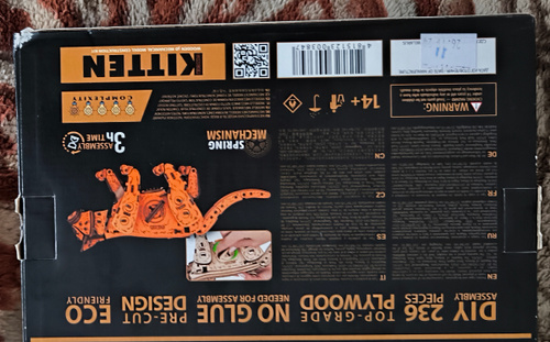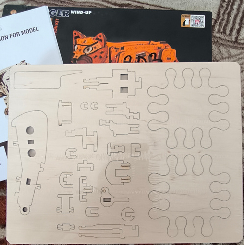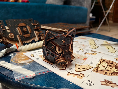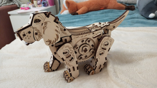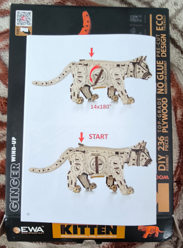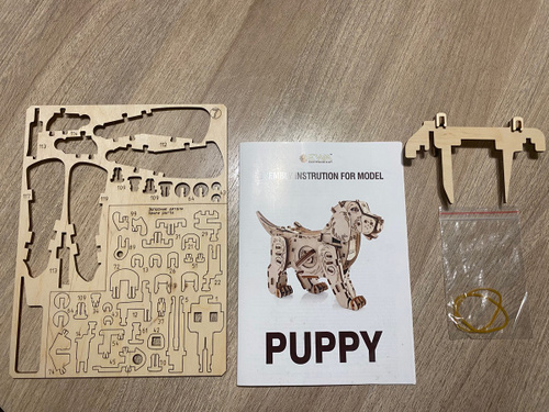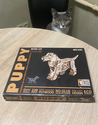 Доброго времени суток! Конструктор очень понравился!! Собирали вдвоем с дочерью 8 лет - просто восторг!! Доставили в срок, коробка в простом почтовом пакете - отсюда и вмятины на коробке, но внутренности))) не пострадали! Деревянные листы с деталями хорошо отшлифованы, выдавливаются супер, при простом нажатии, выдавливал ребенок - ни одной сломанной детали, даже мелкой!! Удобный ключ-помощник, восковой стик коротковат (мне б побольше))), целый блок запасных деталей (которые не понадобились, но это важный плюс), резинки качественные с запасом, механизм ПРУЖИННЫЙ! не на резинке (должен прослужить долго). Прорисовка на деталях очень красивая и качественная. Собирался щенок с большим удовольствием, все детали подходили, пальцы не болели, ничего не отваливалось, не слетало (поверьте, есть с чем сравнить!). Завод мягкий, бегает просто чудо-чудное (кошка в шоке).
