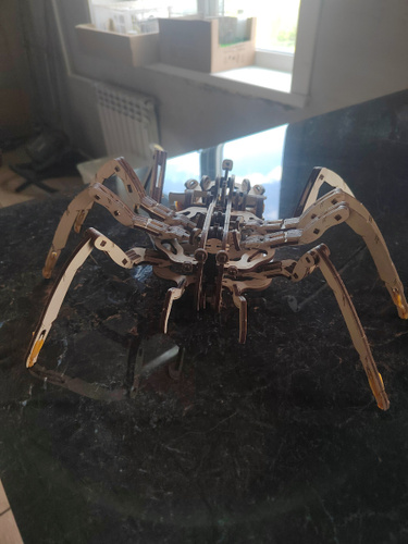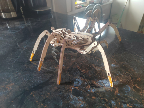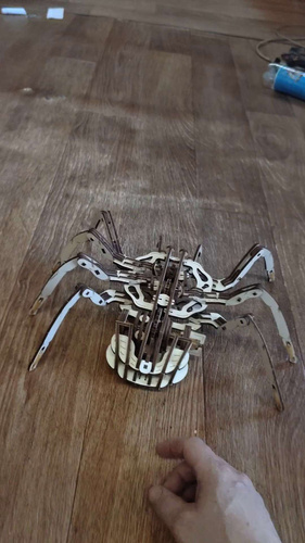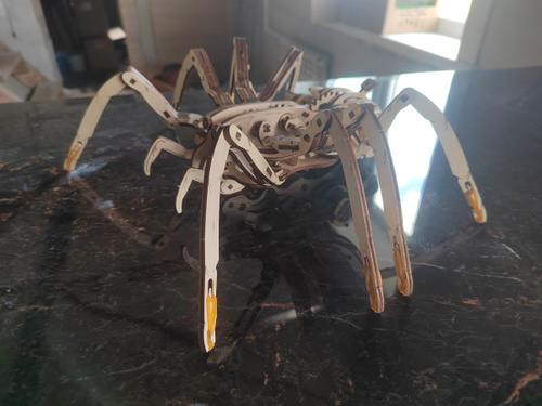 Отламилось на лапке деталька и теперь не держится. Заводишь, а паук не хочет бежать, на весу сразу механизм срабатывает. Собирали полностью по инструкции, по времени ушло чуть больше 2 часов