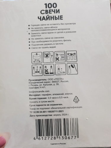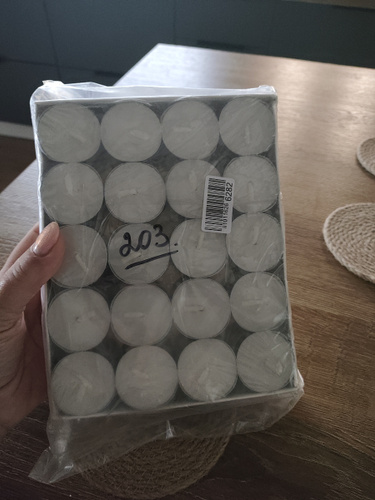Набор из 100 чайных свечей, размер которых варьирует от 1,1 см до 1,4 см в высоту и от 3,7 см до 3,9 см в диаметре. Время горения свечи - 3 часа. Представляем вам набор парафиновых чайных свечей, которые оживят ваше пространство и создадут успокаивающую атмосферу. Каждая чайная свеча тщательно изготовлена из высококачественного парафина, обеспечивающего чистое и ровное горение, которое длится часами. Мерцающее пламя создает мягкое свечение, добавляя нотку тепла и спокойствия к любому случаю, будь то уютный вечер дома, романтический ужин или особое торжество. С помощью нашего набора вы сможете легко придать своему жилому пространству, офису или месту проведения мероприятия особую атмосферу.