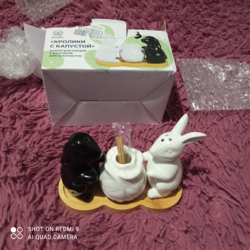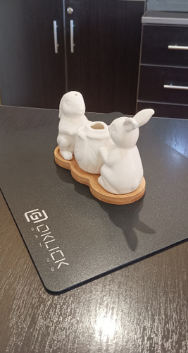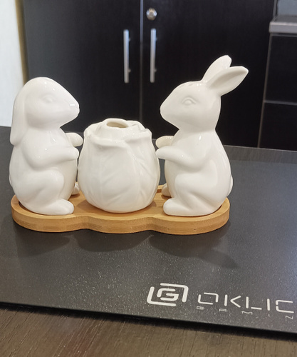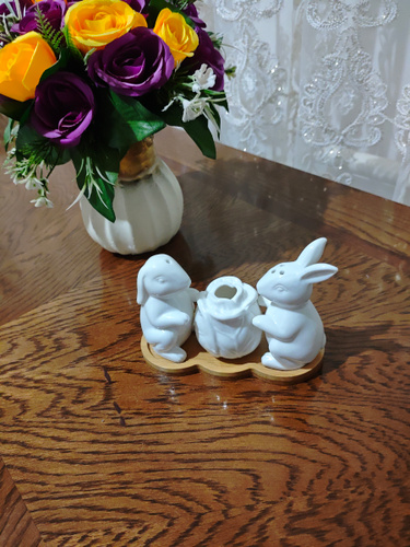 Набор для специй на бамбуковой подставке от Elan Gallery "Кролики" общим размером 10,5х5,8х9,8 см состоит из 2 предметов. В комплект входят: перечница в виде белого кролика размером 4,8х4,8х8 см и солонка в форме чёрного кролика 5х4,5х9 см. Объём каждой фигурки 45 мл. Фигурные ёмкости для соли и перца украсят обеденный стол в будни и помогут создать красивую сервировку праздничного стола. Посуда в виде милых животных выполнена из фарфора и станет украшением интерьера кухни или столовой. Благодаря необычным органайзерам на подставке из натурального бамбука вы можете устроить праздничный ужин у себя дома с сервировкой не хуже, чем в ресторане. Столовые принадлежности для эстетичного хранения соли, перца или приправ позволят держать всё необходимое под рукой в процессе приготовления еды. Можно использовать для любых сыпучих продуктов, например, корицы. Фарфоровые контейнеры наполняются через отверстия внизу, которые закрываются пластиковыми пробками. Не рекомендуется применять абразивные моющие средства. Без подставки декоративные баночки можно использовать в посудомоечной машине. Бамбук нельзя замачивать! Настольный комплект поставляется в стильной картонной коробке. Красивый кухонный инвентарь станет чудесным подарком на любой праздник. Благодаря красочной коробочке не понадобится дополнительная подарочная упаковка. В коллекции бренда Elan Gallery вы найдёте множество как ярких, так и нежных декоративных украшений – каждый обязательно подберёт сувенир на свой вкус. Они станут чудесным подарком для родных, близких и коллег. Наполните пространство вокруг себя уютом и эстетикой!