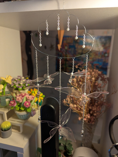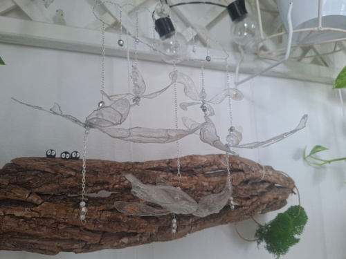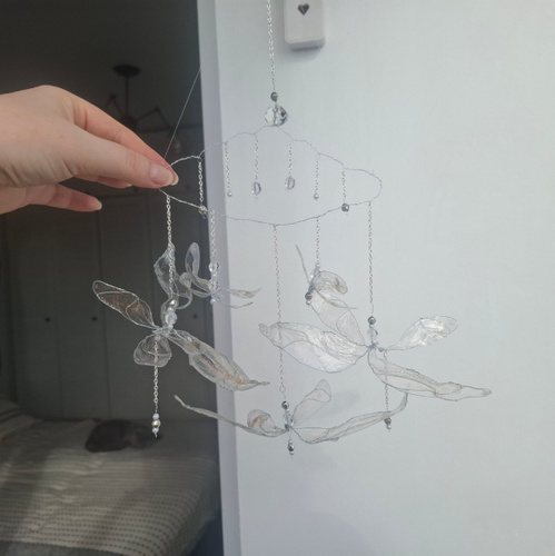 вот такая красота. мне проволоки хватило, как и остальных деталей. Разве что не хватило цепочки, но это просто я уже не экономил на длине подвески. Если что проволока сама серебряного цвета, в золотой просто покрасил. Но учитывайте, что под весом бабочек облачко может немного деформироваться.