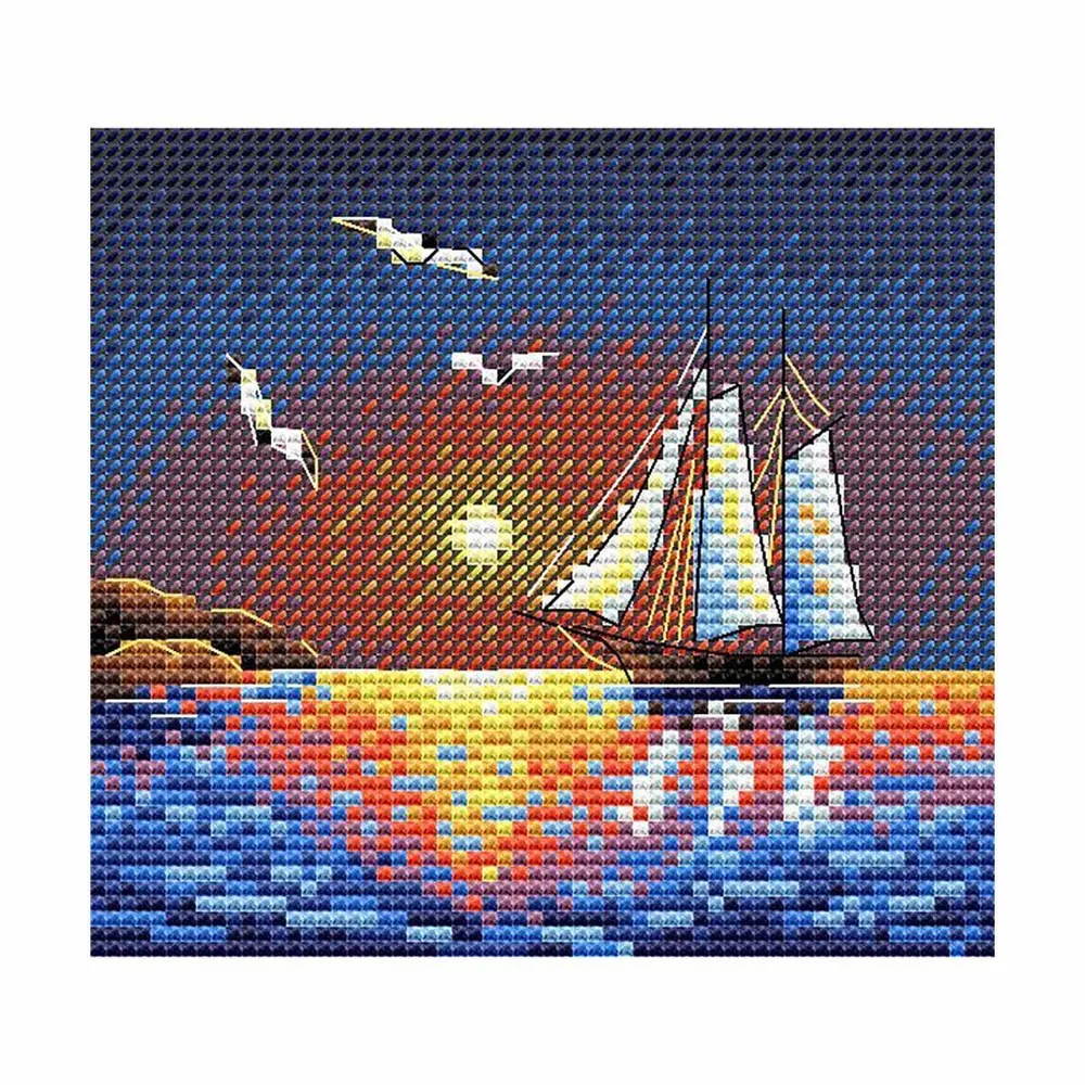 Сюжет В открытом море от МП Студии очаровывает своей реалистичностью и напоминает искусную акварель. Пейзаж будто соткан из света и воды и дарит ощущение спокойствия. Секрет этакого эффекта – в сочетании разных техник: крестики создают насыщенные цвета и плавные переходы, а контрастный стежок бэкстич добавляет четкие контуры и расставляет финальные акценты.