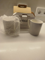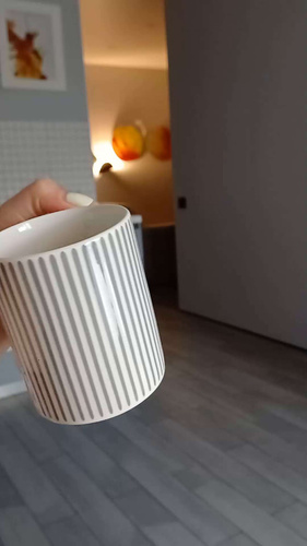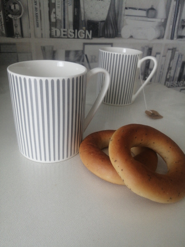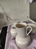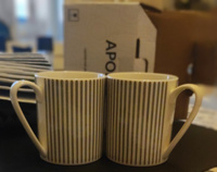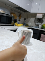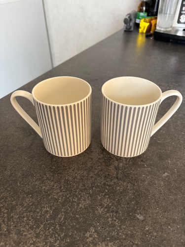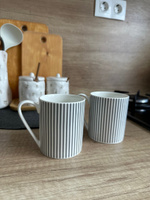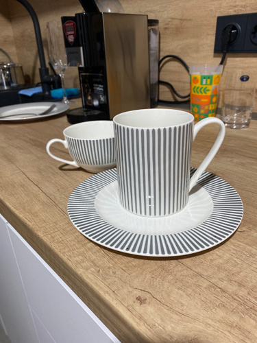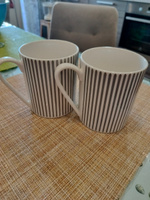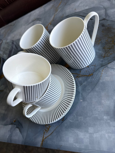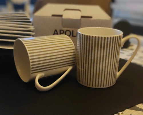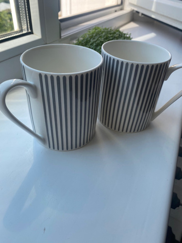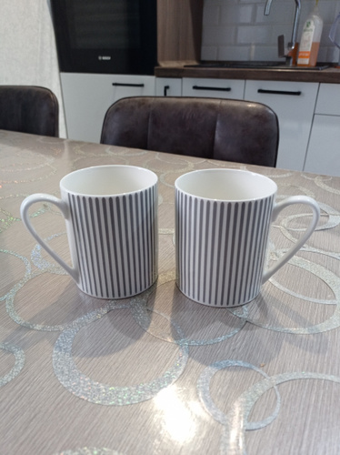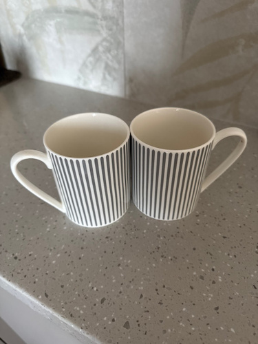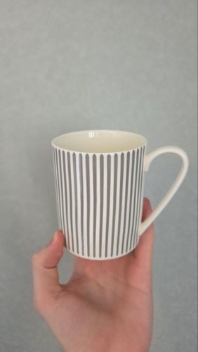 Изящный дизайнЭлегантный белый цвет в сочетании с серыми полосками создаёт неповторимый и запоминающийся вид. Полоски придают кружкам уникальность и выразительность.