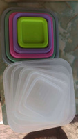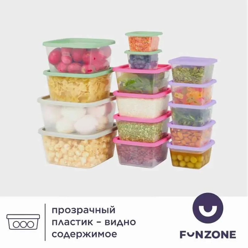 Большой набор контейнеров квадратной формы идеально подходит для хранения продуктов питания. Он поможет вам в организации пространства на полках кухонных шкафов или в выдвижных ящиках на кухне, а также в холодильнике или в кладовой комнате. Комплект состоит из 15 лотков, выполненных из безопасных полимеров. Пищевой пластик, из которого они изготовлены, не содержит бисфенол - А, не впитывает запахи еды и подходит для использования в микроволновой печи и мытья в посудомоечной машине. В набор входят 6 разных объемов контейнеров - от самых маленьких размером мини, до больших емкостей 0,15 л; 0,33 л; 0,63 л; 1,1 л; 1,7 литров. Они имеют прозрачную крышку и волнообразное дно, которое отводит конденсат от продуктов. На каждый бокс нанесена мерная шкала. Они прекрасно подходят для хранения специй - перца, приправ и корицы, круп - рисовой, гречневой, манки, сахара, соли, муки, яиц, сыра, кондитерской смеси, кофе, чая, печенья, варенья, макарон, конфет, сухофруктов и других сладостей. Высокие пластиковые коробки подходят для замораживания фруктов, ягод и овощей и хранения их, а также пельменей в морозильной камере холодильника или морозилке. Коробочки подойдут для хранения лекарств. Также они очень удобны для хранения различных мелких вещей и бытовых мелочей - настольных игр, хозяйственного инвентаря и различных бытовых и женских приспособлений. Они подойдут под различные средства хозяйственные средства, типа стирального порошка. Компактные продуктовые кухонные контейнеры плотно закрываются плоской крышкой, поэтому их можно носить на работу в офис или брать с собой в дорогу. Стильные прозрачные емкости прекрасно подходят для упаковки бутербродов на работу и еды на офисный ланч. Лотки плотно закрываются. Вы можете поместить в контейнер готовую еду, собираясь в поездку на дачу, в туристический поход или вылазку на отдых на природу. Органайзеры заменят вам посуду на пикнике. Пластмассовые принадлежности с крышкой, выполненные из пищевого пластика, помогут вам навести порядок и создать домашний уют в доме.