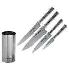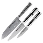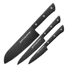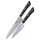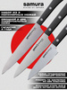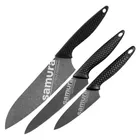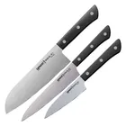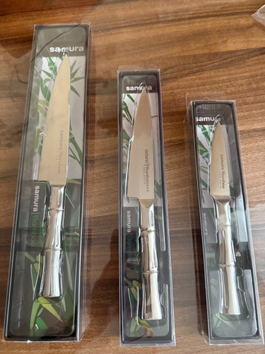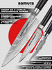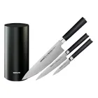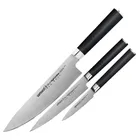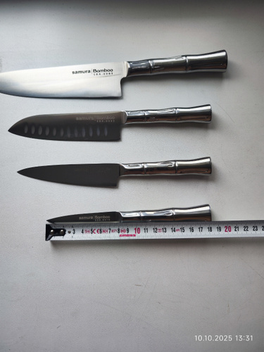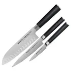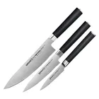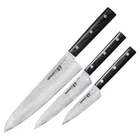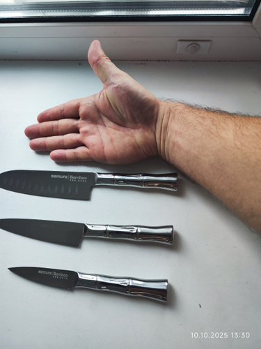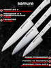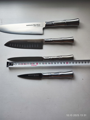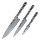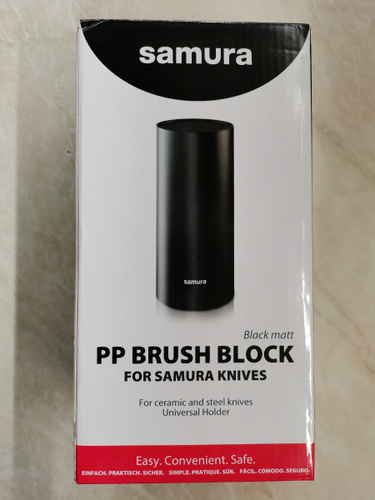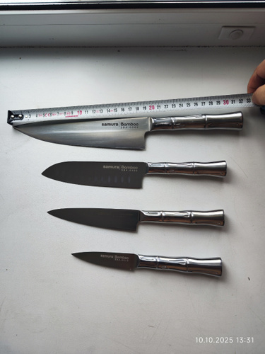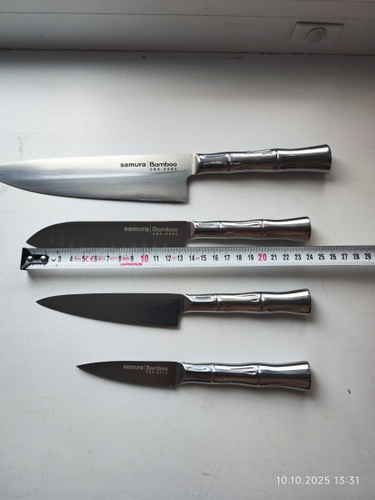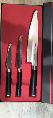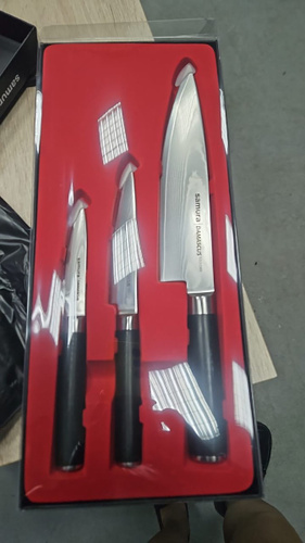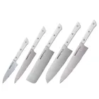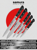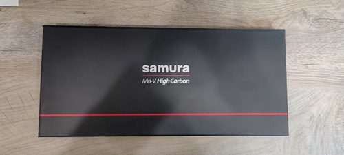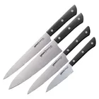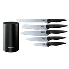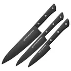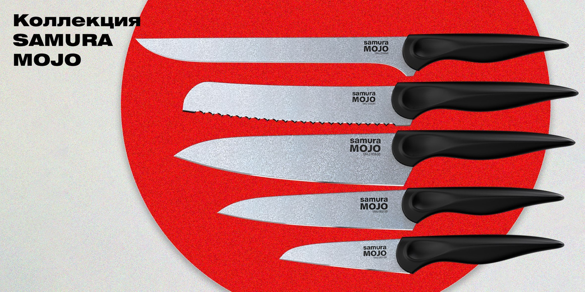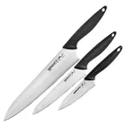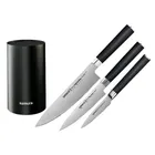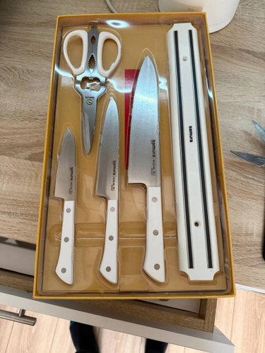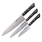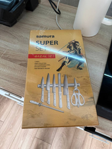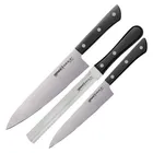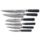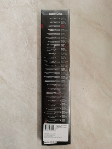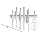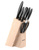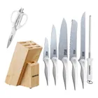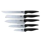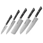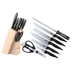 Овощной нож SMJ-0010B/K - 1шт, универсальный нож SMJ-0023B/K - 1шт, шеф нож SMJ-0085B/K - 1шт, филейный нож SMJ-0048B/K - 1шт, хлебный нож SMJ-0055B/K - 1шт, мусат металлический - 1шт, ножницы кухонные - 1шт, подставка для ножей деревянная - 1шт