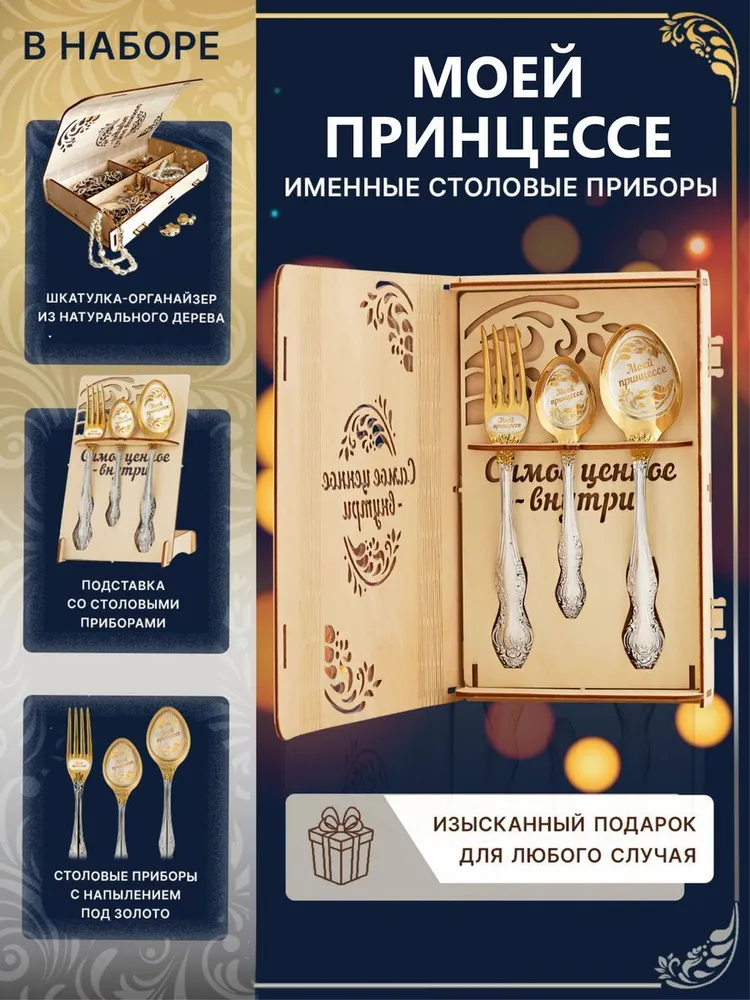 Именной набор столовых приборов - оригинальный женский подарок для ваших близких и друзей. Подарите любимым уникальные эмоции с нашими именными столовыми приборами! Мы предлагаем вам не просто идею или посуду, а целый мир воспоминаний и радости, который будет радовать каждый день. Почему это лучший выбор? Индивидуальный подход: Каждое изделие создается специально для вас! Это идеальный способ показать свою заботу, знак внимания, а красивая деревянная упаковка делает набор прекрасным памятным сувениром. Высокое качество: Столовые приборы изготовлены Павловским заводом им. Кирова из высококачественной нержавеющей стали, которая гарантирует долговечность на многие годы. Необычный подарок: Будь то день рождения (др), юбилей, годовщина свадьбы, новоселье или любой другой праздник, подарочный набор станет незабываемым, прикольным именным подарком для женщины, девушки, который вызовет восторг и благодарность. Элегантный дизайн: ложки и вилка комплекта отличаются стильным и элегантным дизайном, который подойдет для любого стиля сервировки стола. Эмоции и воспоминания: подарите вашим близким возможность вспомнить самые теплые моменты каждого дня. Каждый раз, когда они будут использовать именные столовые приборы, они будут вспоминать о вас и о том тепле, которое вы вложили в этот подарок.