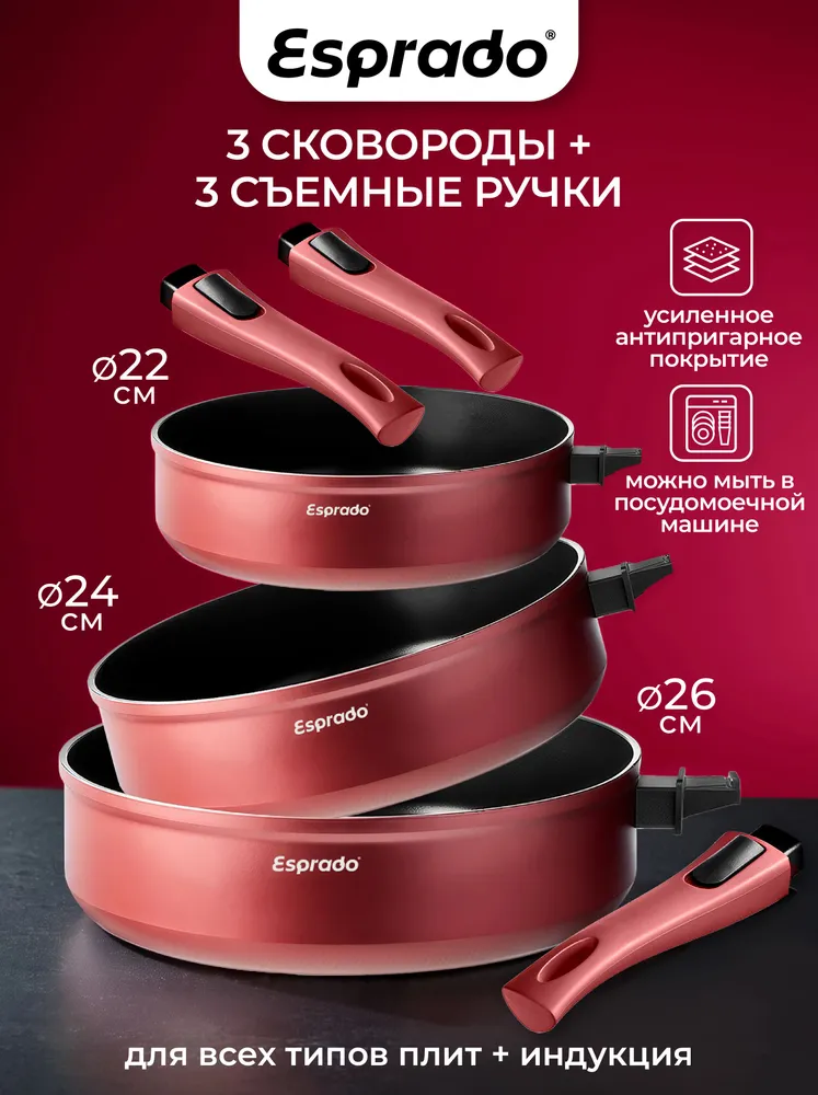 Сковорода глубокая 3 в 1 подойдут ценителям универсальных решений и обладателям небольших кухонь. Многофункциональную глубокую сковороду «3-в-1» также можно использовать в качестве сотейника и формы для запекания. Благодаря съемной ручке Вы сможете использовать эти сковороды в духовке (при температуре до 230˚C), а при хранении – экономить место. Утолщенное индукционное дно обеспечит равномерный нагрев, а трехслойное премиальное антипригарное покрытие Whitford® Eclipse – безопасное использование на долгий срок. Эффектный цвет внешнего покрытия и съемная ручка с эффектом Soft-touch позволят получать еще больше удовольствия от процесса приготовления. Esprado – сохраняем тепло!