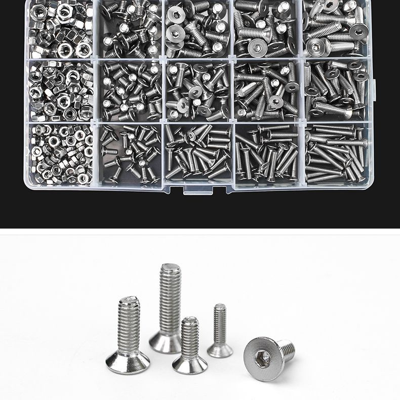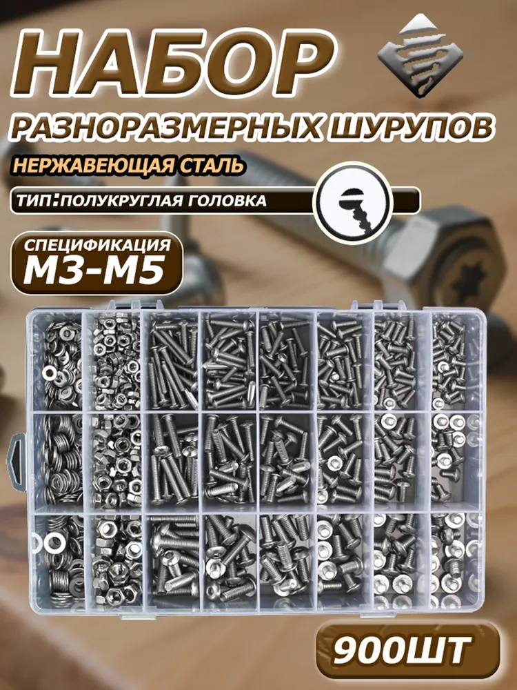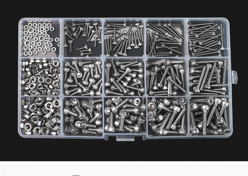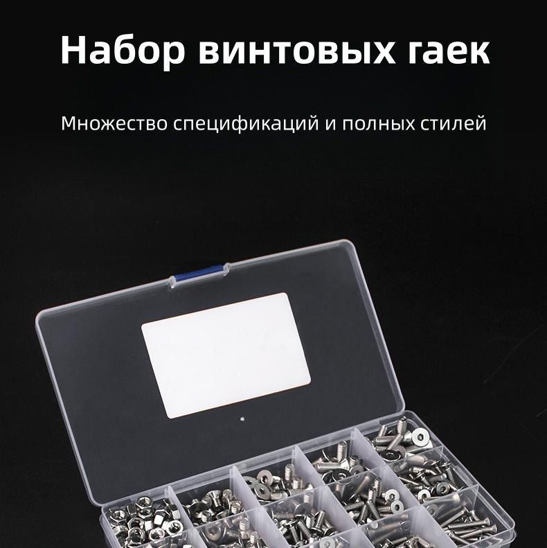 M3 Шайба 150шт. M3 гайки 150шт. M3*20 25шт. M3*16 25шт. M3*12 25шт. M3*10 25шт. M3*8 25шт. M3*6 25шт. M4 Шайба 90шт. M4 гайки 90шт. M4*20 15шт. M4*16 15шт. M4*12 15шт. M4*10 15шт. M4*8 15шт. M4*6 15шт. M5 Шайба 60шт. M5 гайки 60шт. M5*20 10шт. M5*16 10шт. M5*12 10шт. M5*10 10шт. M5*8 10шт. M5*6 10шт.