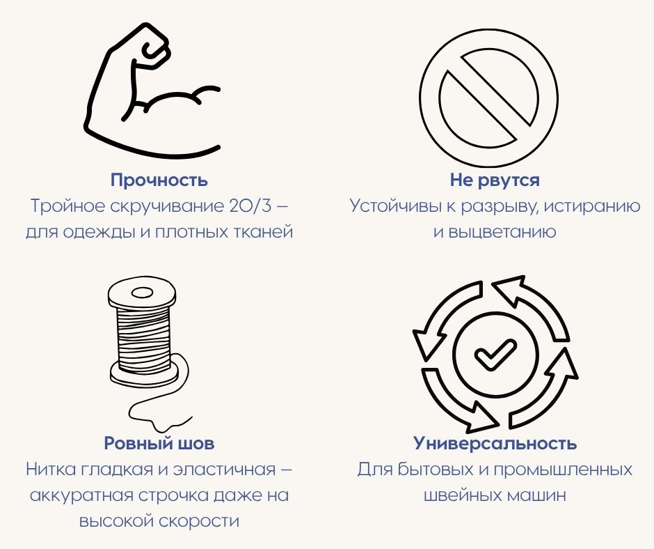 Нитки обладают высокой устойчивостью к разрыву, истиранию и выцветанию, не дают усадки и сохраняют форму после стирки. Благодаря силиконовой обработке, нити легко проходят через ткань, не рвутся и не спутываются даже при работе на высоких скоростях. Подходят для промышленных и бытовых швейных машин, а также для оверлоков.