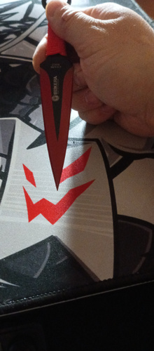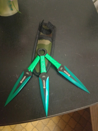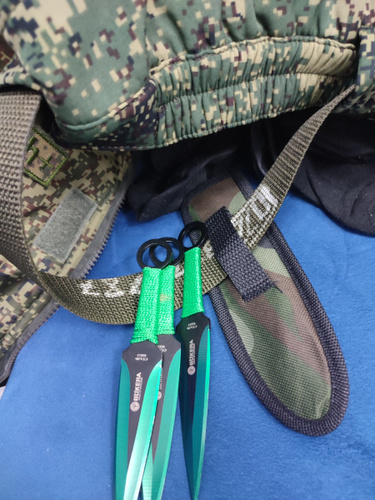 Рисунок лежит не ровно,краска слазит быстро,заточен не важно. В остальном красивый набор из трех штук,в камуфляжном чехле,с тремя ножнами. Наконечник заострен нормально. В дартсборд и бревна втыкается.