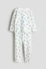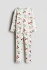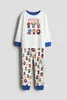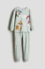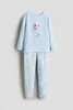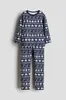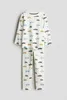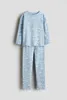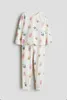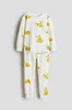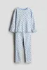 Пижама из мягкого хлопкового трикотажа с принтом в виде мотивов. Рубашка с длинным рукавом и манжетами на вырезе и рукавах. Брюки с эластичным поясом и манжетами для ног.