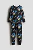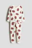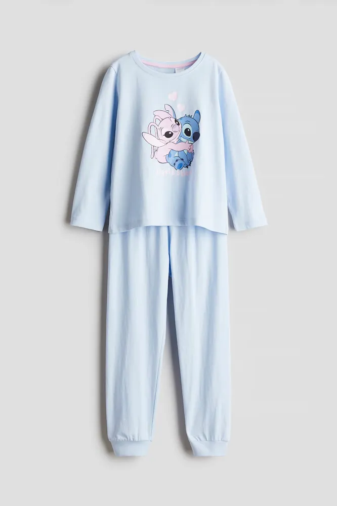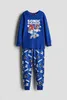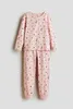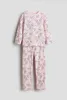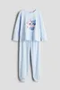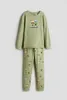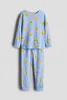 Пижама с рубашкой с длинным рукавом и брюками из мягкого хлопкового трикотажа. Рубашка с принтом спереди. Брюки с эластичным поясом и манжетами для ног.