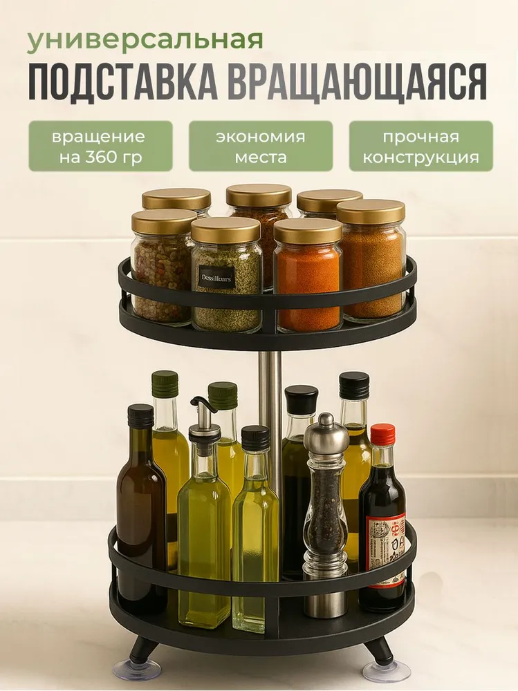 Особое преимущество — вращающаяся конструкция. Полочка под специи позволяет быстро найти нужную баночку, не создавая хаоса среди других емкостей. Все приправы будут аккуратно организованы и находиться на виду. Такая крутящаяся подставка делает готовку удобной и приятной, особенно при активной работе на кухне. Полочка выполнена из прочных, экологичных материалов, устойчивых к воздействию влаги и жира. Лаконичный и современный внешний вид гармонично впишется в любой кухонный интерьер — от классического до минималистичного. Она подходит для хранения как стандартных баночек, так и нестандартных емкостей. Полка на стол значительно экономит место и делает рабочую поверхность организованной. Это практичное решение для повседневного использования, которое оценят как профессиональные повара, так и любители домашней кухни. Подставка на кухню — это не просто предмет быта, а важный элемент комфорта и порядка, который упрощает готовку и сохраняет настроение на высоком уровне.