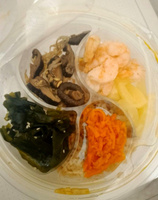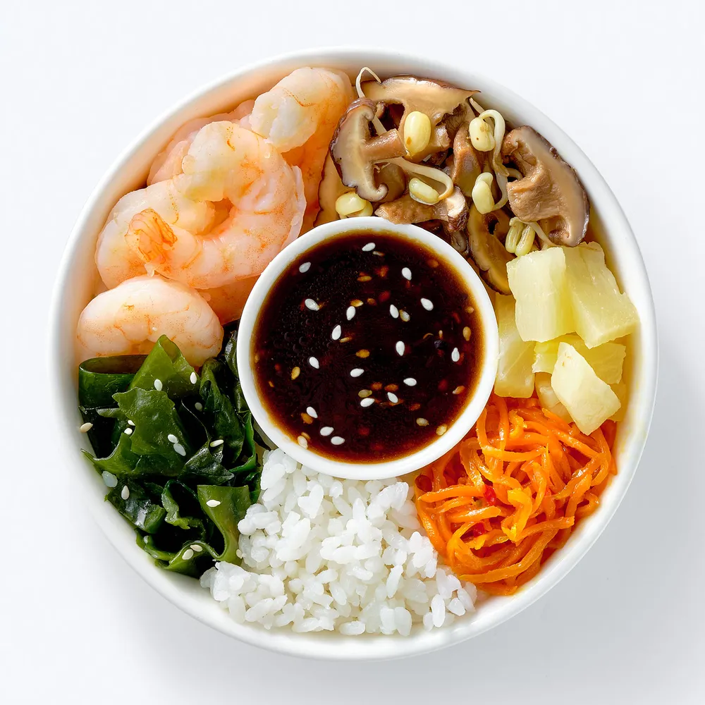 рис отварной заправленный (рис отварной (крупа рисовая экстра, вода питьевая), заправка для риса (уксус рисовый, сахар, соль, соус рисовый (вода питьевая, рисовый экстракт, сахар, уксус рисовый), масло подсолнечное рафинированное дезодорированное), креветка отварная белоногая (Litopenaeus vannamei) (произведено из замороженного сырья), соус «Поке» (соус сладкий чили (сахар, вода, перец чили 22%, соль, чеснок, загуститель кукурузный крахмал, регулятор кислотности уксусная кислота ледяная, загуститель ксантановая камедь), масло подсолнечное рафинированное дезодорированное, соус соевый (вода, соевые бобы, пшеница, соль), масло кунжутное нерафинированное, соус бальзамический (концентрированное виноградное сусло, бальзамический уксус Модены 20% (винный уксус (вино, антиокислитель пиросульфат калия), концентрированное виноградное сусло, краситель колер сахарный), модифицированный кукурузный крахмал)), грибы шиитаке с ростками фасоли обжаренные (грибы шиитаке отварные, маш (бобы пророщенные), масло подсолнечное рафинированное дезодорированное, соль, чеснок сушеный молотый, перец сычуаньский молотый), ананасы консервированные (ананасы, вода, сахар, регулятор кислотности лимонная кислота), морковь пассерованная с соусом (морковь свежая, масло подсолнечное рафинированное дезодорированное, соус сладкий "Чили" (сахар, вода, перец чили 22%, соль, чеснок, загуститель кукурузный крахмал, регулятор кислотности уксусная кислота ледяная, загуститель ксантановая камедь), водоросли Вакаме в кунжутном масле (сушеные резанные водоросли Вакаме, масло кунжутное нерафинированное, семена кунжута очищенные).