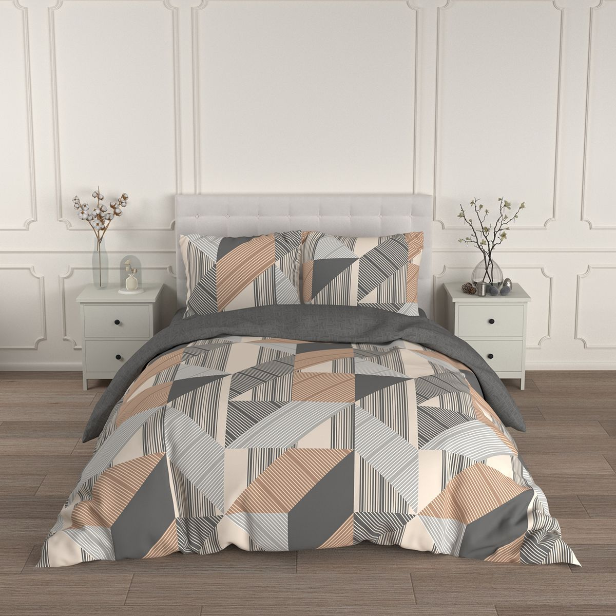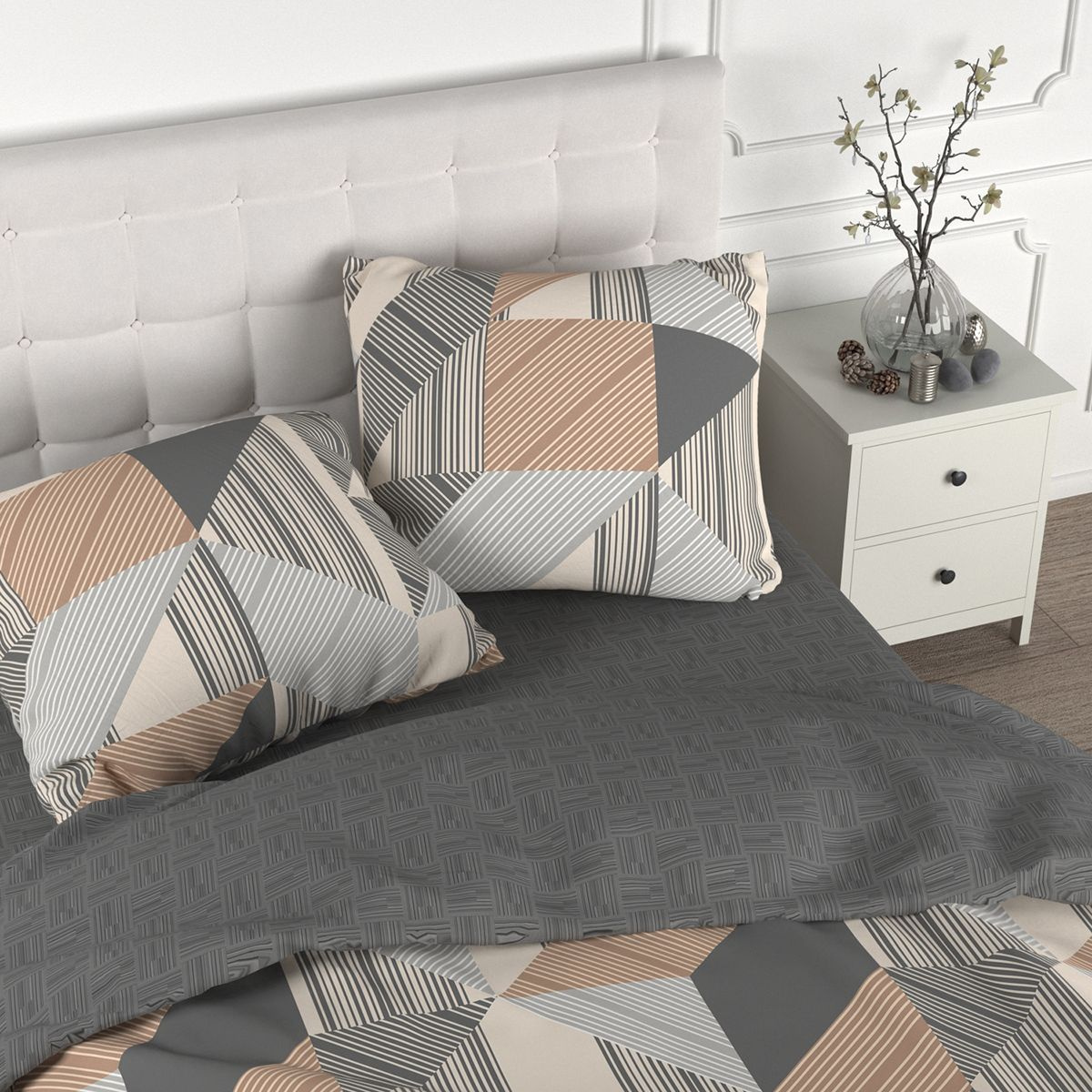 Расцветка шикарная, узоры и тона благородные, сдержанные. Не совсем бежевая, конечно простынь и часть пододеяльника. Что-то между светлым хаки, серым и бежевым, очень благородный модный не кричащий оттенок. По разном освещении по-разному играет.