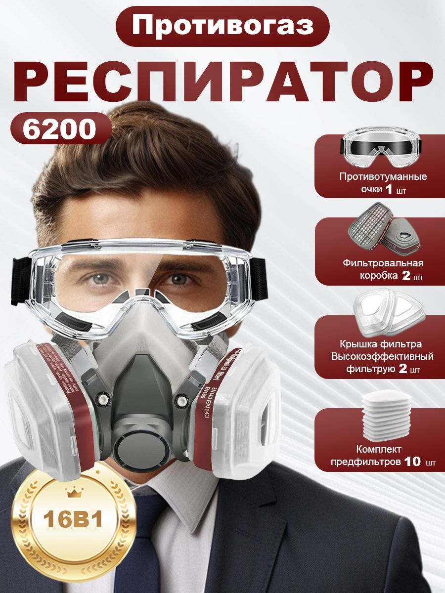 Респиратор профессиональный FFP3 универсальный с угольным фильтром от химии, пыли, для покраски + 10 фильтров и очки