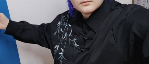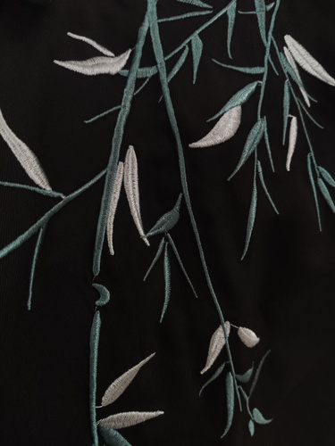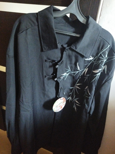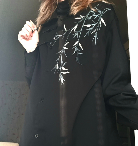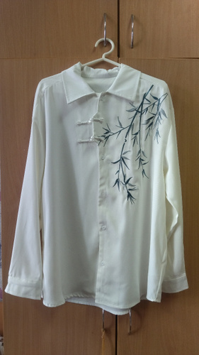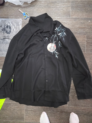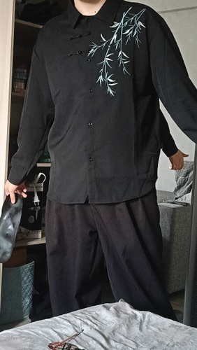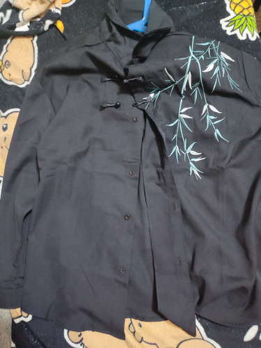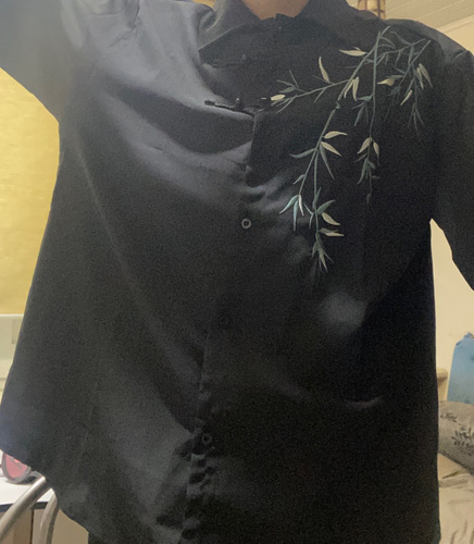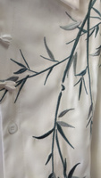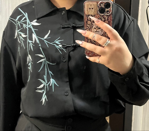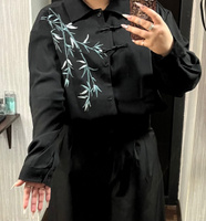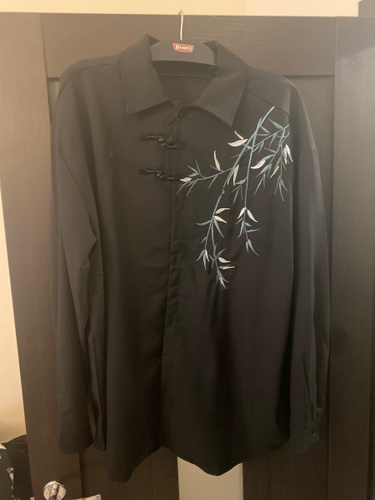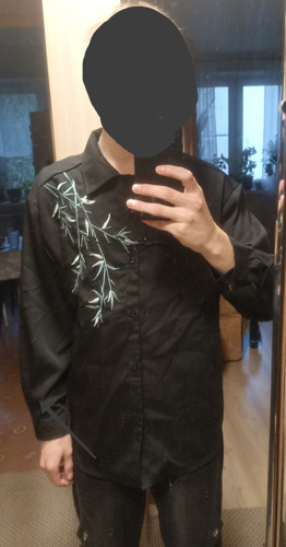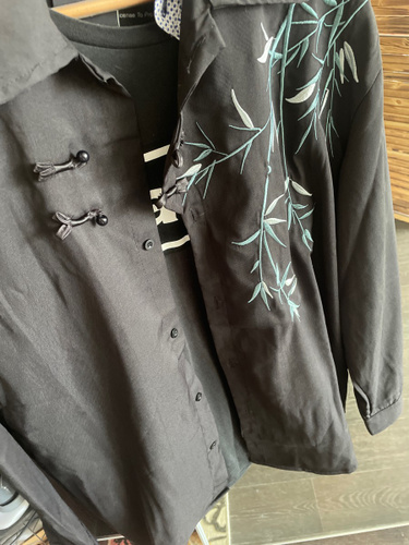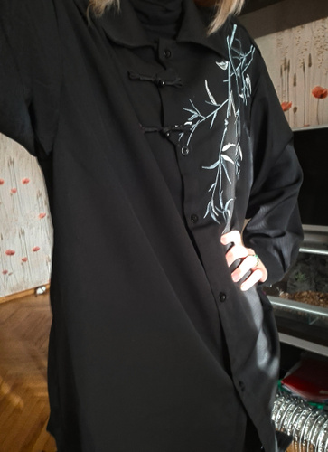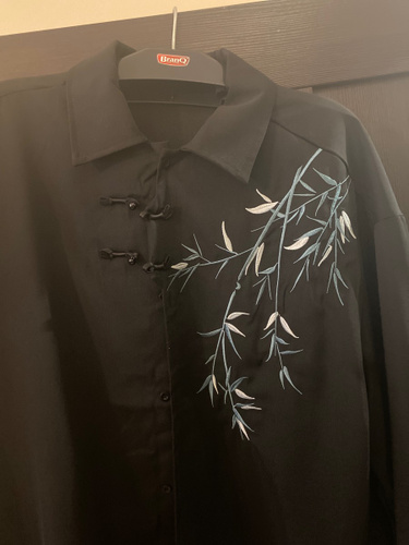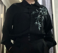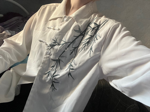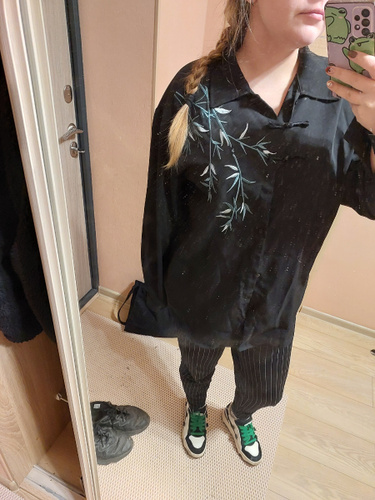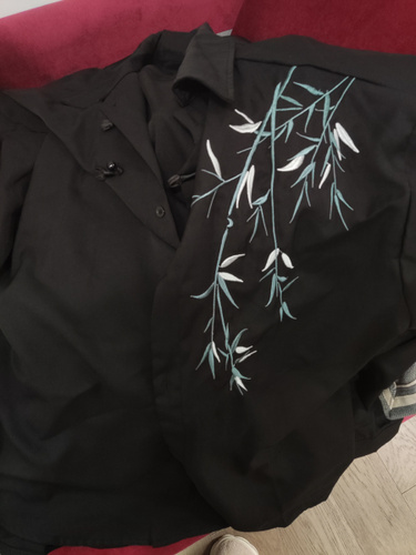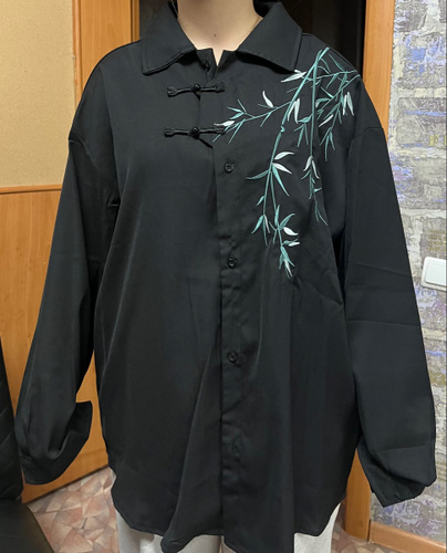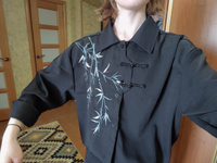 Рубашка замечательная! Заказывала на свой размер, оверсайз, сидит отлично! Ткань плотная, синтетическая, самое то на холодное время года! Бамбук вышит очень качественно, мне понравилось. Пуговки-жемчужины сначала сложно просовываются в застёжки, поэтому перед первой ноской советую сначала несколько раз их просунуть в петельки и вынуть.