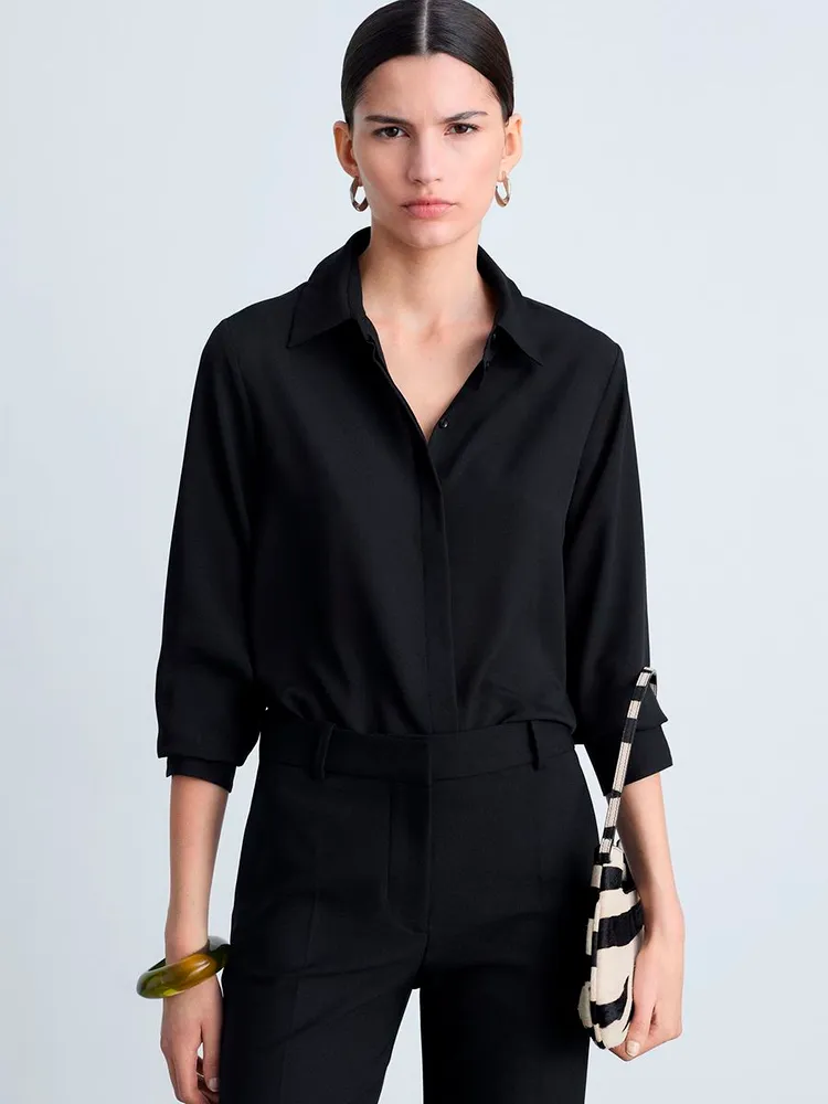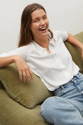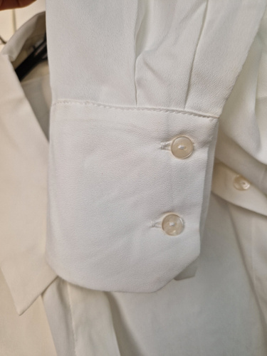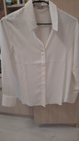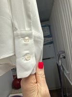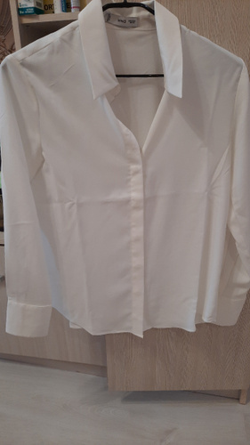Рубашка хорошая. Сидит отлично, базовая, подойдет под многие образы. Цвет не белоснежный, а слоновая кость скорее. Единственный минус- это то, что она электризуется, т.к. ткань синтетика, но это указано было в карточке товара.