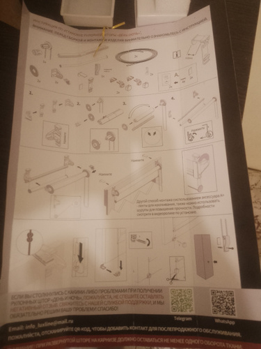 Но, открыв последнюю картонную коробку, увидела, что пластиковую упаковку уже вскрывали. Верхнее крепление было наполовину собрано, пакет с саморезами открыт, все неаккуратно. Неприятно. Одна втулка видимо не влазила в трубку, так её туда запихали, что срезали пластиковые бороздки. Обратно я ее не смогла вытащить. Хорошо, что все было в комплекте. Но продавцу желательно проверять отказной товар.