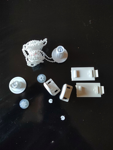 Труба с тканью - 1шт. Цепь управления - 1 шт. Крышка нижняя боковая - 2 шт. Аллюминиевая труба утяжелитель - 1 шт. Ограничитель цепи управления - 1шт. Платформа для скотча - 2 шт. Скотч - 2 шт.