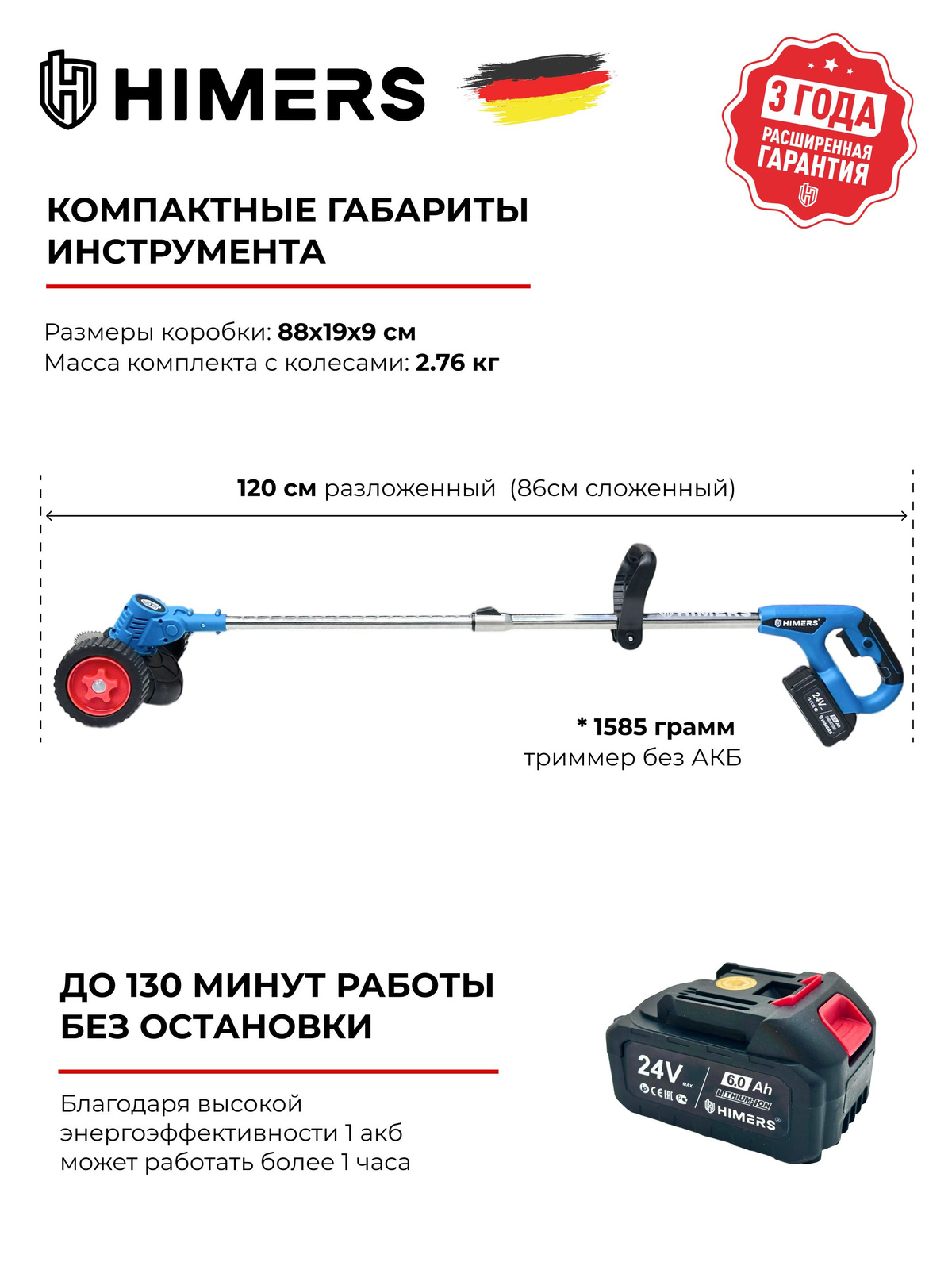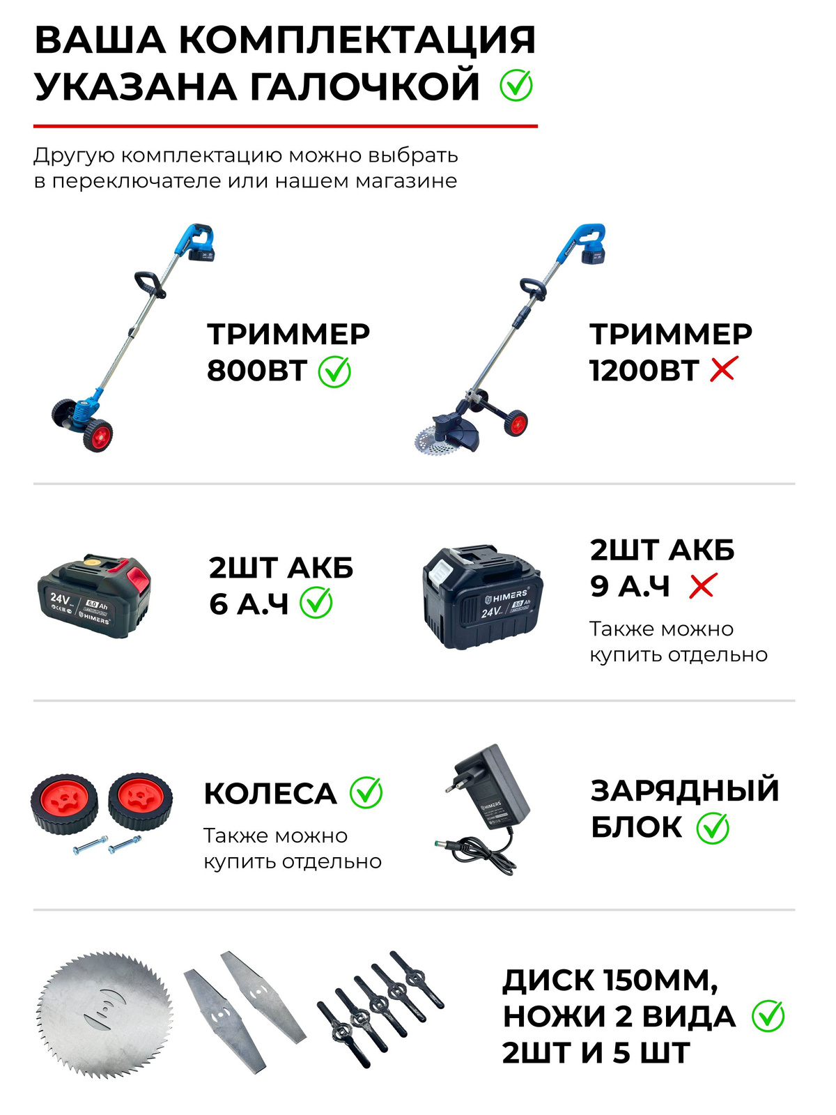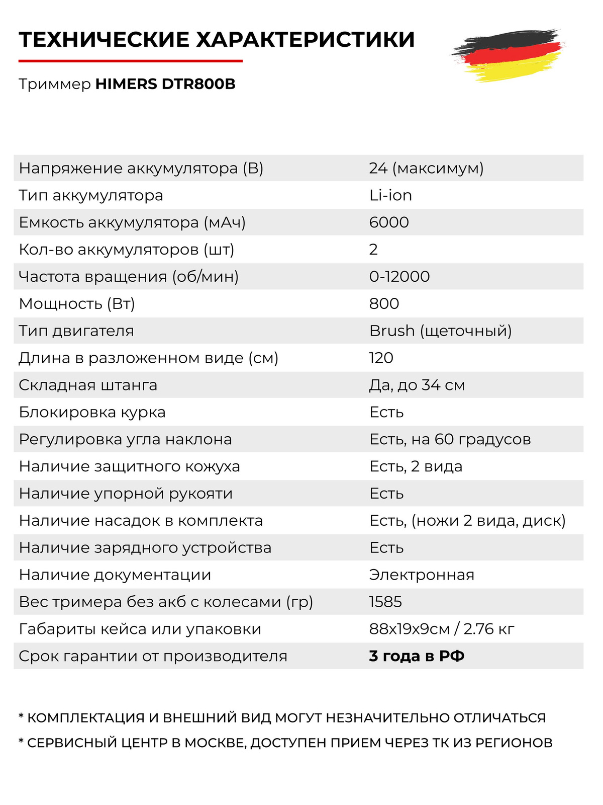 ОСНОВНАЯ КОМПЛЕКТАЦИЯ: * Тушка триммера * 2 аккумулятора * Зарядное устройство * Ссылка и QR-код на электронное руководство по использованию и гарантийное обслуживание ДОПОЛНИТЕЛЬНАЯ КОМПЛЕКТАЦИЯ: * Коробка транспортировочная * 8 насадок (3 вида) * Кожух защитный 2 вида * Упорная крукять * Колеса 2шт КОМПЛЕКТАЦИЯ МОЖЕТ НЕЗНАЧИТЕЛЬНО ОТЛИЧАТЬСЯ!