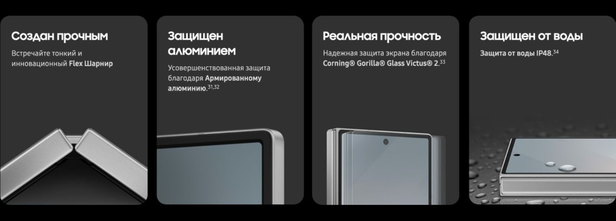 Отметим, что при создании смартфонов Galaxy Z особое внимание уделялось защите устройств от повреждений. Благодаря усовершенствованной технологии, волокна системы очистки стали короче, защищая смартфон от попадания пыли и других мелких частиц внутрь шарнира, и при этом обеспечивая износостойкость и быстрое переключение между внешним и основным экраном. Гибкий экран защищён ультратонким стеклом Samsung Ultra Thin Glass с особым многослойным полимерным слоем. Благодаря добавлению панельного слоя и защитной пленки он выдерживает не менее 200 000 складываний – т.е. возможность складывания и раскладывания до 100 раз в день на протяжении 5 лет.