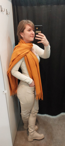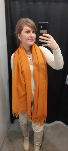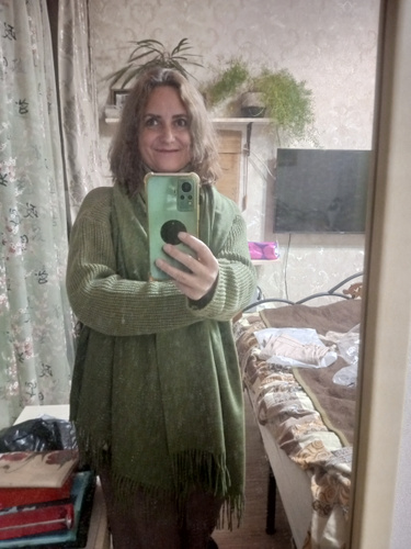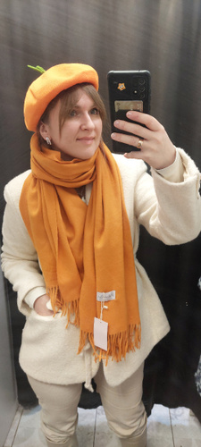 Шарфик очень хороший, мягкий, теплый, объемный. На легкое пальто сверху самое то, что нужно. Спасибо продавцу.