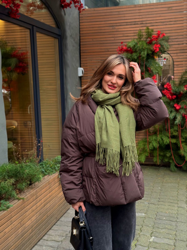 Здравствуйте! Цвет шарфа хаки немного приглушенная зелень.