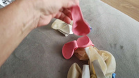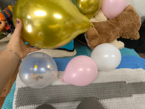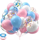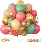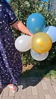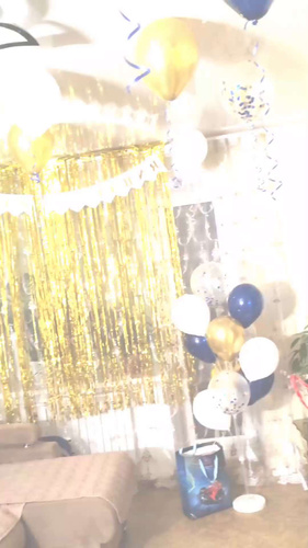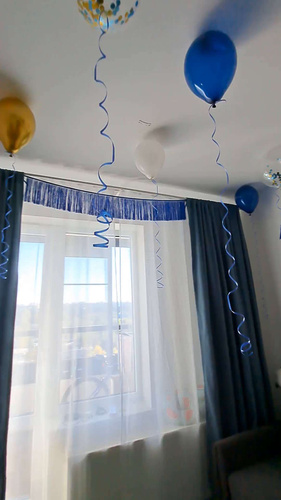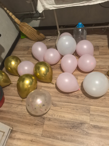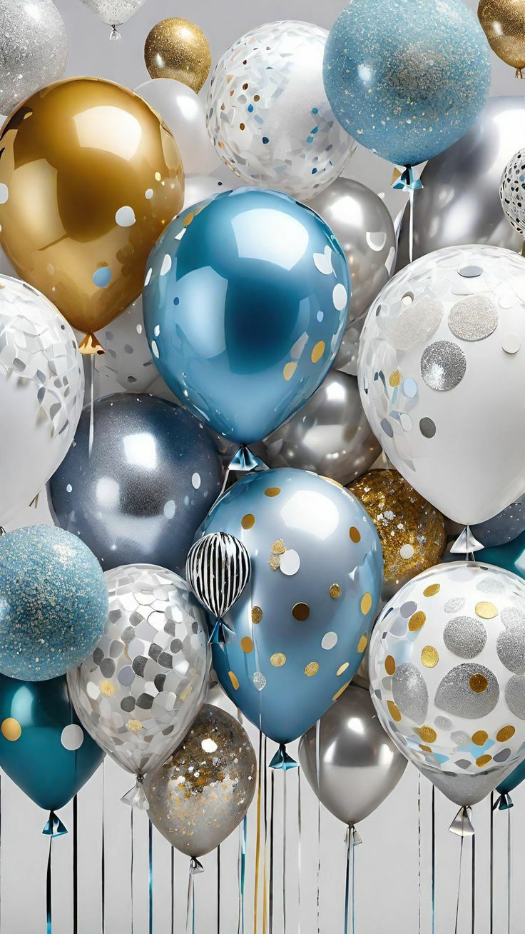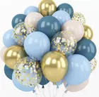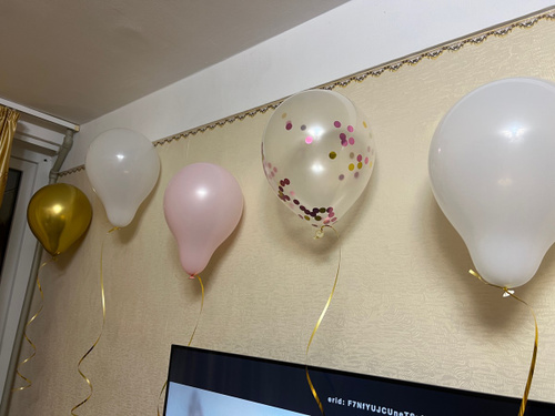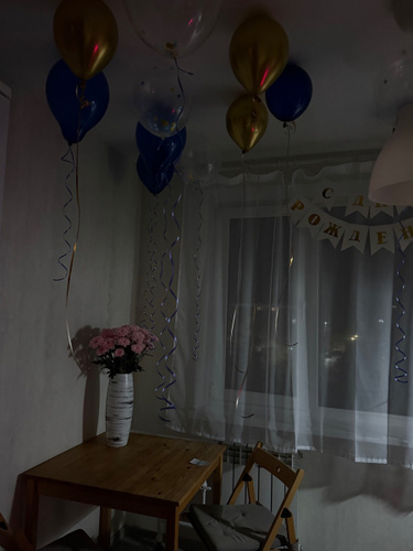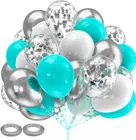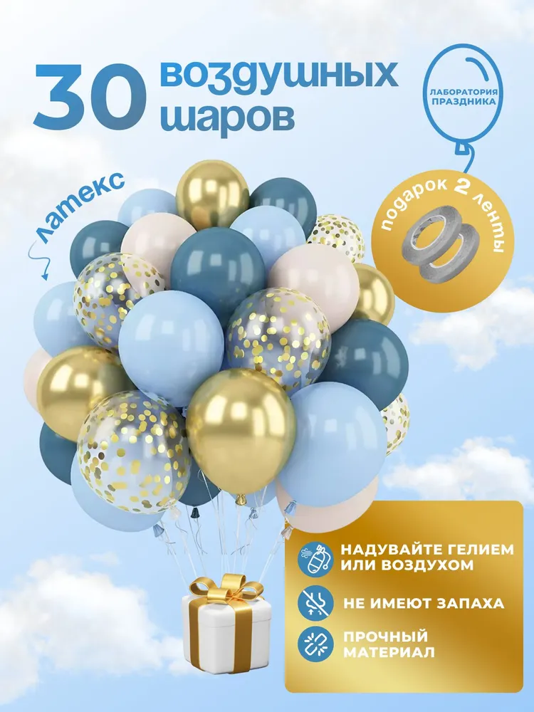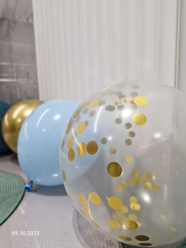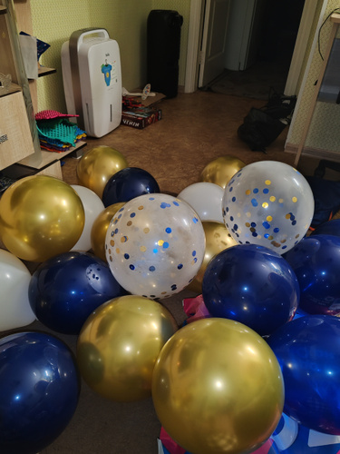 В комплект входит: 8 шаров темно сине-зеленых, 8 шаров голубых, 8 шаров золотых, 6 шаров с конфетти, 2 декоративные ленточки.