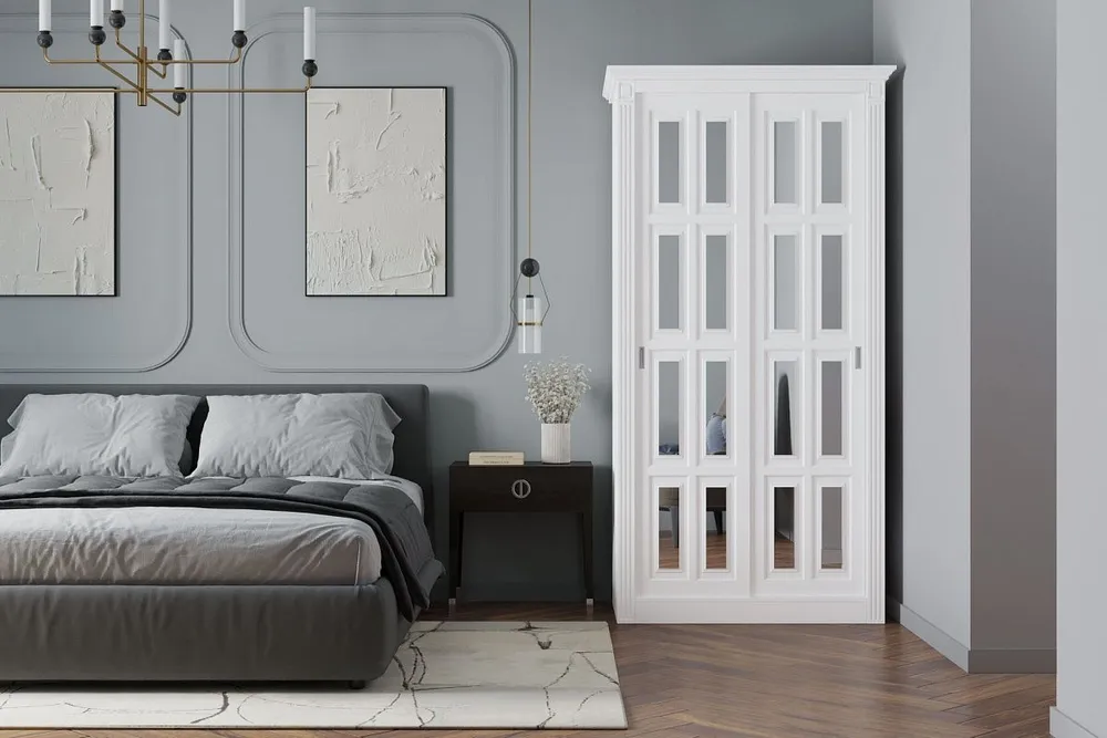 Особенности: Пилястры входят в общий габарит по ширине шкафа.; Карниз по высоте + 6 см, выступ карниза по бокам по 4,5 см.; Карниз и пилястры изготавливаются из МДФ в цвет фасада.; Зеркала крепятся с помощью стеклодержателей.; При глубине менее 600 мм вместо горизонтальной штанги устанавливается выдвижной кронштейн