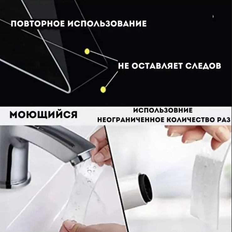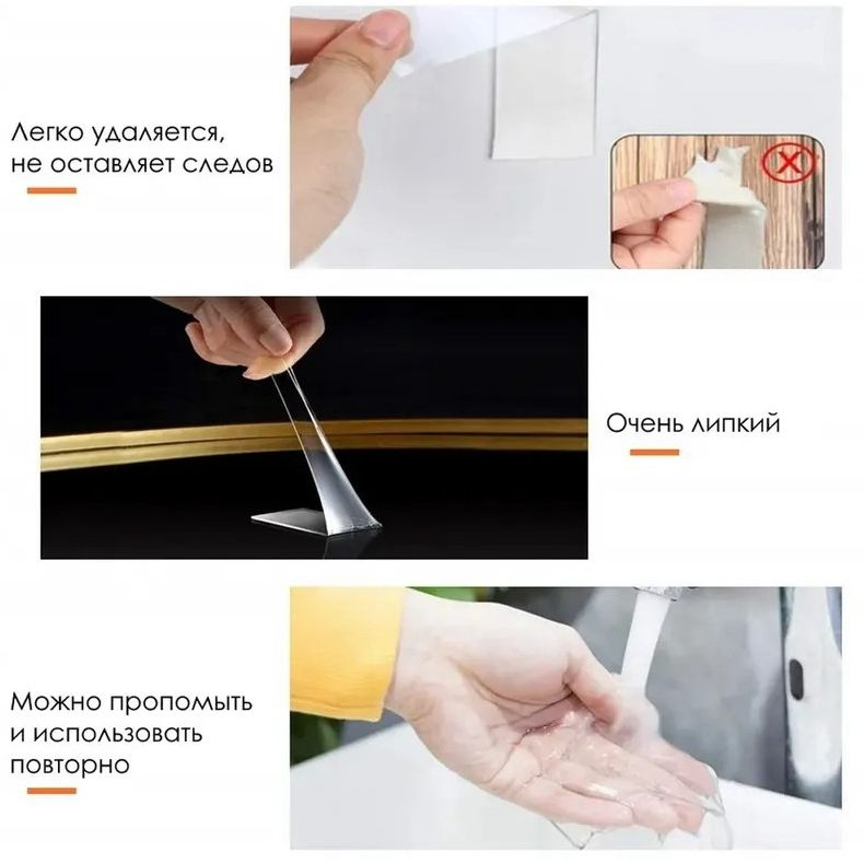 Многоразовая клейкая лента в своей основе имеет силиконовый клей он прозрачный и придает свойство нано материала, двухсторонняя клейкая лента практически невидима и не портит интерьер.