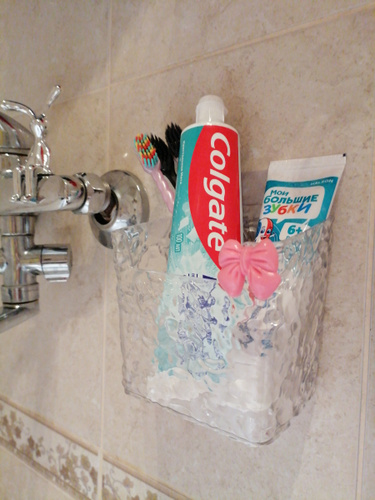 Стильный и практичныйСтакан под зубные щетки имеет прозрачную конструкцию, которая позволяет вам всегда видеть содержимое, что избавляет от необходимости искать зубные щетки или пасту, особенно утром, когда вы торопитесь. А еще в комплекте идет симпатичный бантик, которым вы при желании сможете украсить аксессуар.