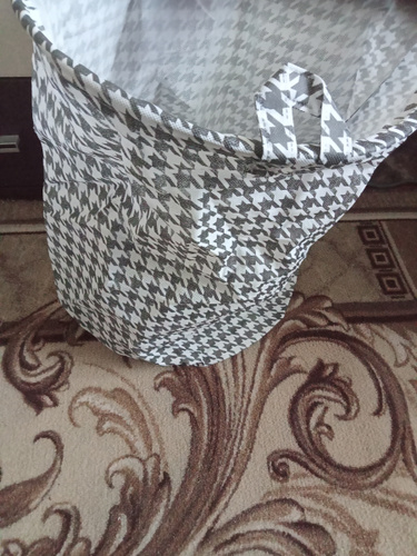 Пришло вовремя, хорошо упакован.Ткань плотная,стоит даже в пустом виде с ручками,вместительная.Мне она очень понравилась,покупайте.