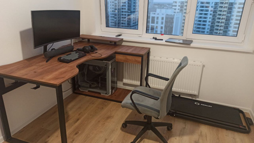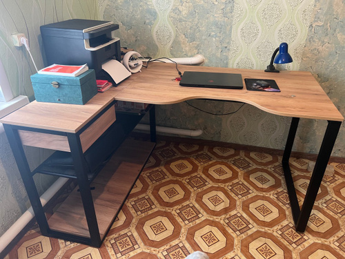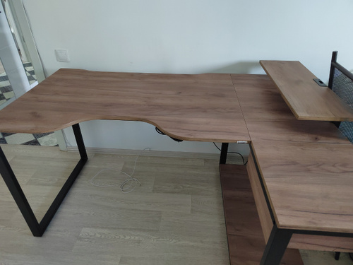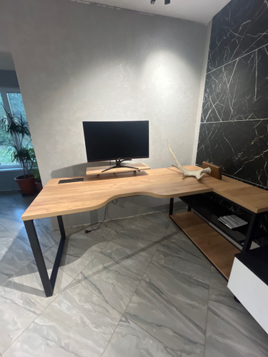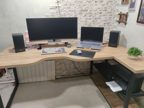 ◾ Угловая конструкция позволяет эффективно задействовать угол комнаты, освобождая центральную зону. Большой стол даёт достаточно места для мониторов, ноутбука, документов, оргтехники — всё под рукой.