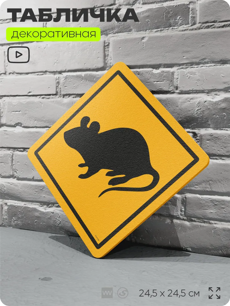 Табличка прикольная "Осторожно, крысы" на дверь и стену, информационная и предупреждающая, декоративный знак, 24,5х24,5 см, пластиковая, Айдентика Технолоджи. Желтая предупреждающая табличка с изображением животного, предназначенная для использования на двери и стену, идеально подходит для дома, дачи, фермы, а также контактного зоопарка, мест обитания зверей, рыб и птиц, пастбища, заповедника, парка и других общественных мест. Подходит для мест у дороги с повышенным риском встретить диких животных. Стильная универсальная табличка яркого желтого цвета из серии CONCEPT служит надежным предупреждающим знаком и отлично заметна в различных условиях. Размер таблички 24,5х24,5 см — оптимальный для удобного восприятия информации на расстоянии. Информационная табличка крепится на дверь, стену, забор, клетку или столб с помощью двустороннего скотча, который идет в комплекте и обеспечивает надежное и аккуратное крепление без сверления. Удобное и универсальное навигационное решение для любых пространств: ветеринарных клиник, зоомагазинов, парков, зоопарков, а также жилых домов. Коллекция табличек CONCEPT содержит большой выбор информационных и предупреждающих знаков, среди которых декоративные таблички с изображением животных помогают привлекать внимание и эффективно информировать посетителей и сотрудников о возможном присутствии животных или соблюдении безопасности. Декоративная прикольная табличка может служить декором для офиса, кабинета или комнаты, быть шуточным дополнением в интерьере. Наши таблички отлично подойдут как декор для вечеринок, тематических мероприятий, детских праздников и конкурсов. Применений для наших табличек – множество. Табличка с лаконичной и понятной инфографикой визуально предупреждает о необходимости соблюдать осторожность, повышая уровень безопасности и предотвращая неожиданные происшествия. Предупреждающие знаки серии CONCEPT отлично подходят для использования в зонах с повышенной проходимостью, таких как общественные заведения, торговые площади, рынки, парки, зоопарки и природные заповедники. Их можно использовать как визуальные предупреждения на дверь, стены, вход в помещение, на клетку. Наша декоративная табличка с животными — это надежный способ повысить внимание и безопасность посетителей, если нужно, или добавить настроения в интерьер.